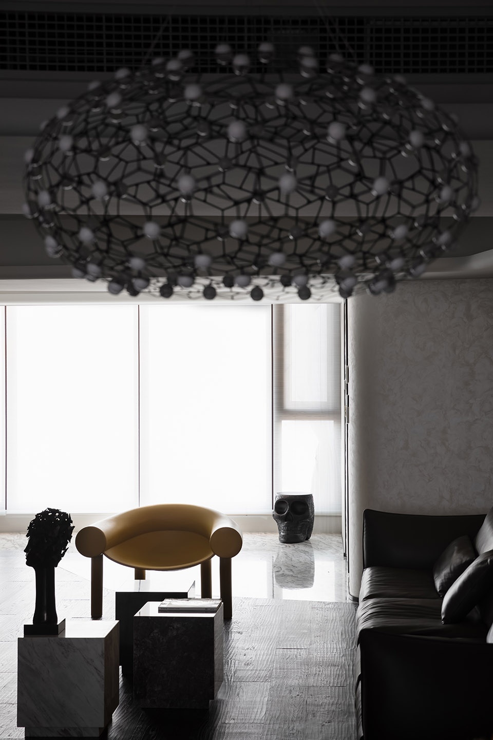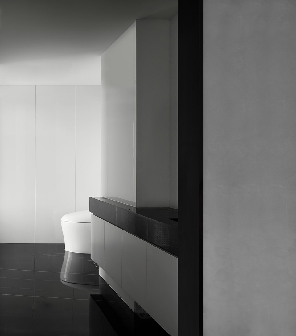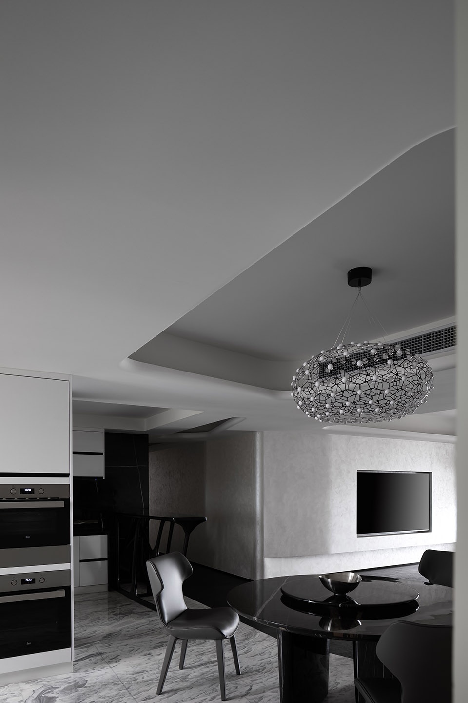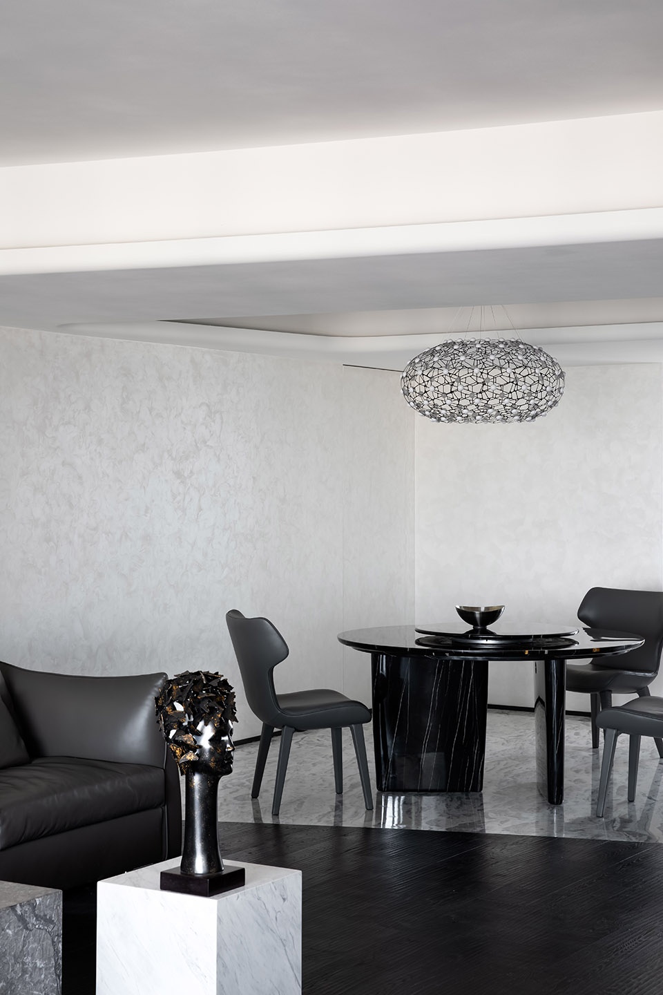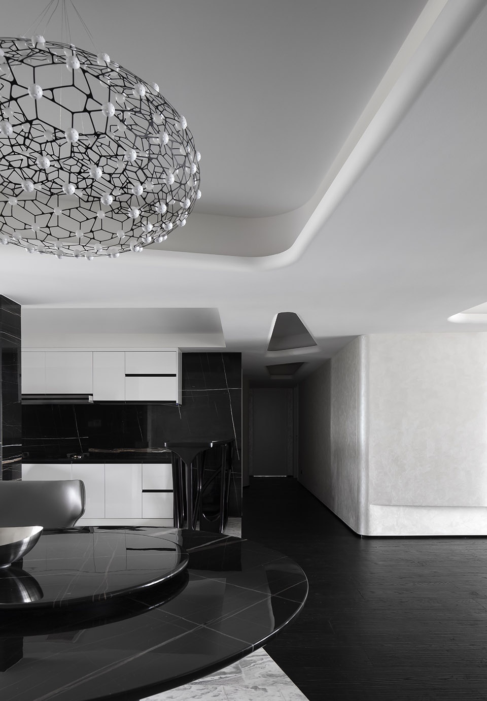 The project is defined as a cool gentleman, a rational and logical living environment. The space seems to be dynamic, an existence to stabilize the changing physical world. It is a kind of logic outside of geometry, a form in motion. With a character that combines calmness and elegance, it is like a fashion darling dressed in a black tuxedo. The color palette of black and white, and the simple yet exquisite furnishings, showcase our new explorations into the decoration of human living environments, and pursuit of a minimalist lifestyle. Going after large spatial scale, futuristic surfaces and smart home system, this is our understanding and impression of modern luxury homes. Functionality is only to meet the basic demands of modern life, while experience and sense of rituality are pursuits at a higher level, which are becoming increasingly important. What we are exploring is using space to express one’s temperament and personality.