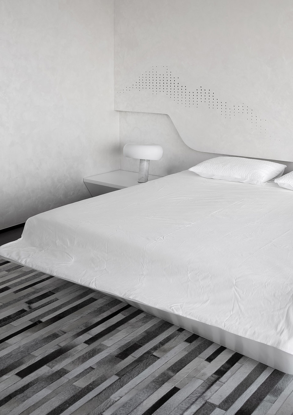 卧室以白为向,弧线与客厅的元素相呼应,和谐统一。白色的天花、墙体、床品搭配黑色木地板,结合灯光设计,营造动静相宜的空间环境。