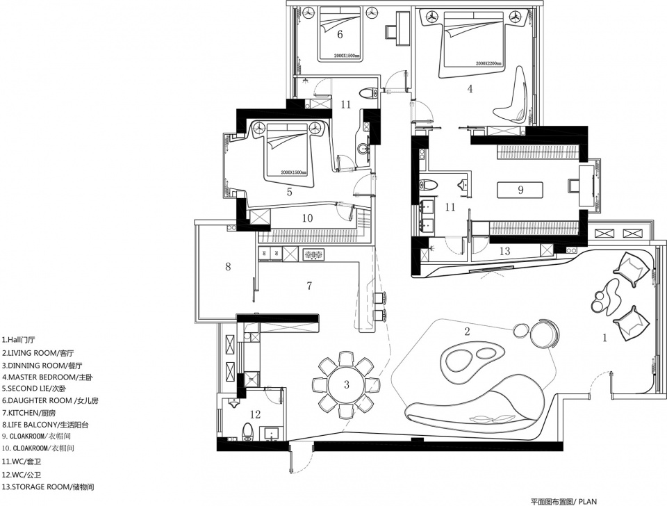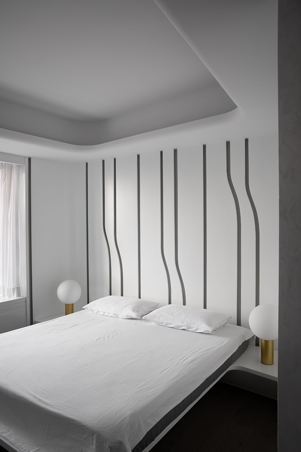 The bedroom is dominated by a white tone, with the curved lines corresponding with the elements of the living room, harmonious and unified. The white ceiling, walls and beddings go well with the black wooden floor, combined with lighting design, creating a spatial environment which intermingles the dynamic and static.