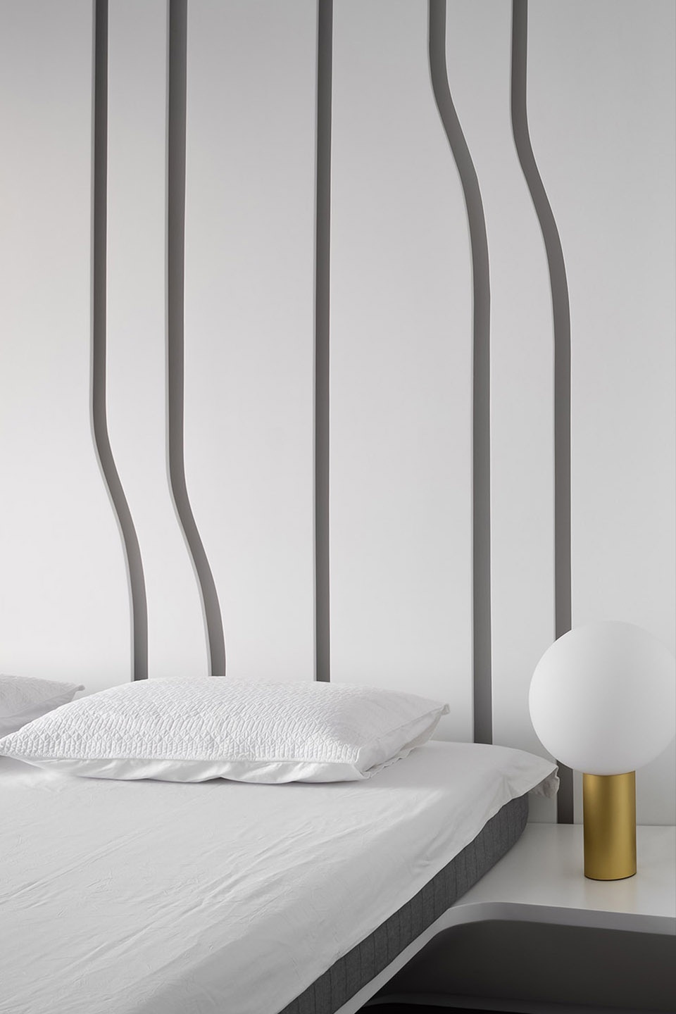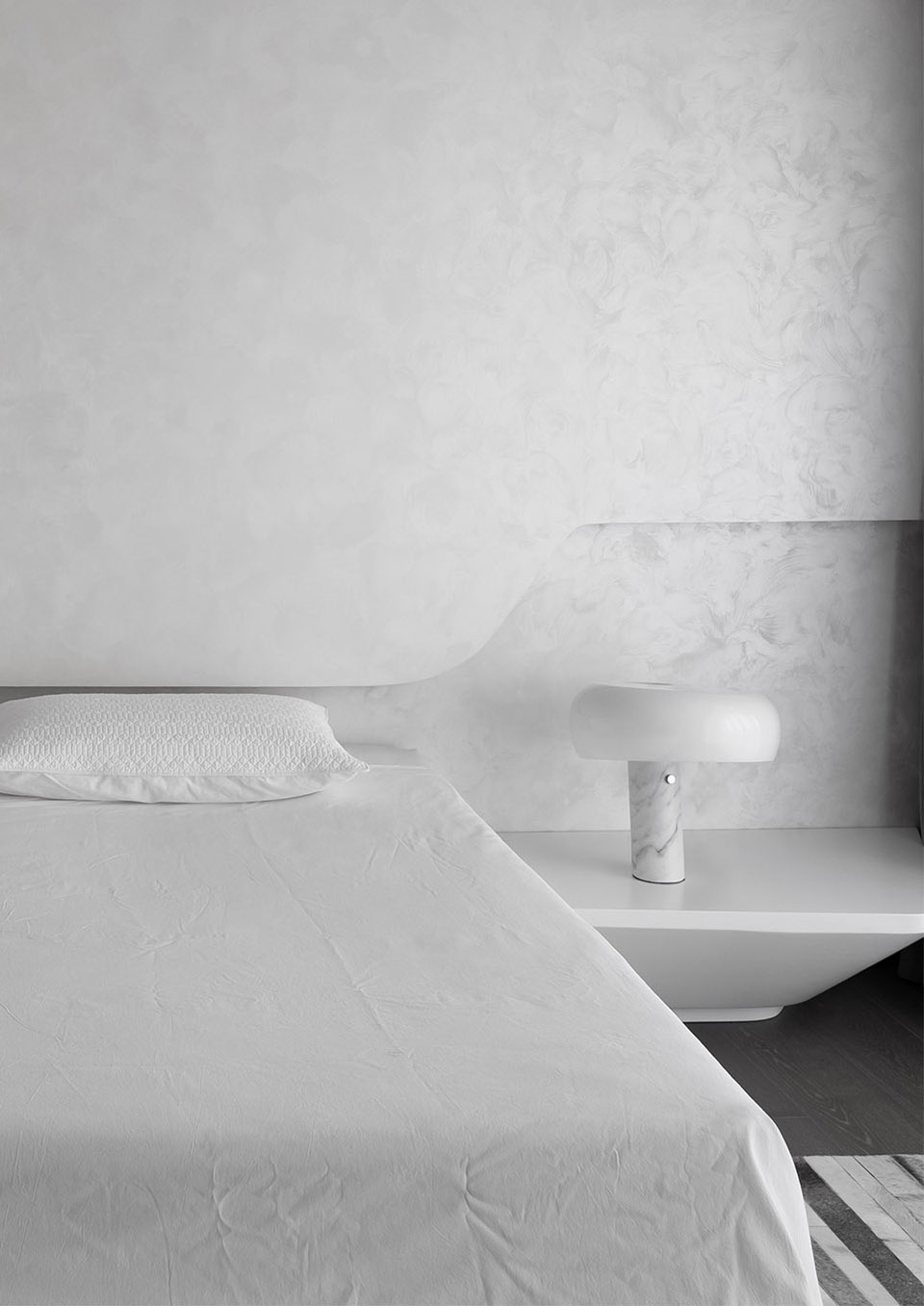 ▼卧室以白为向,弧线与客厅的元素相呼应,bedroom is dominated by a white tone, with the curved lines corresponding with the elements of the living room