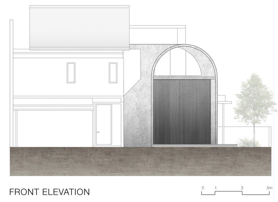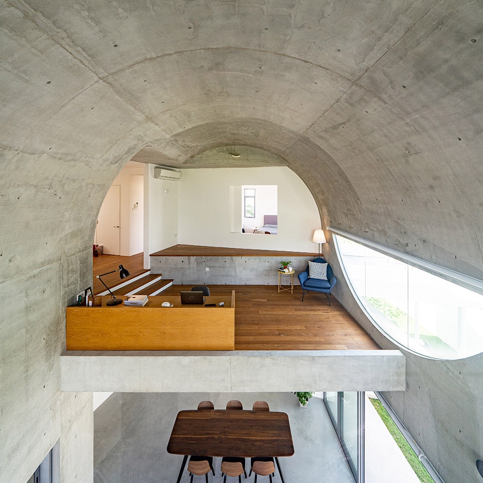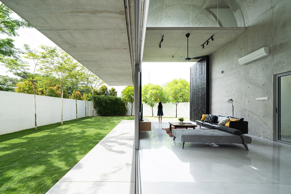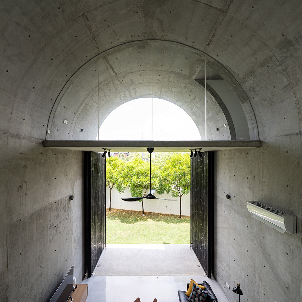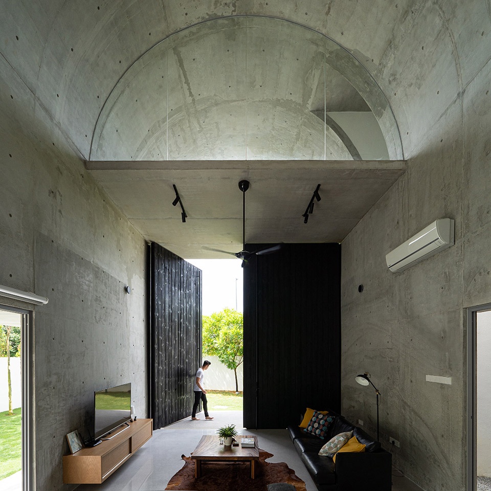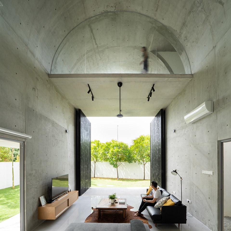 An arch roof extends outwards, creating a vaulted annex that forms the living spaces. The space appears continuous through the extension of the arch and exaggerated further through the materiality of the concrete finish from floor to ceiling. The extension is further enhanced by two large doors that open up to the garden. The uninterrupted perspective from inside out immediately connects the interior with nature.