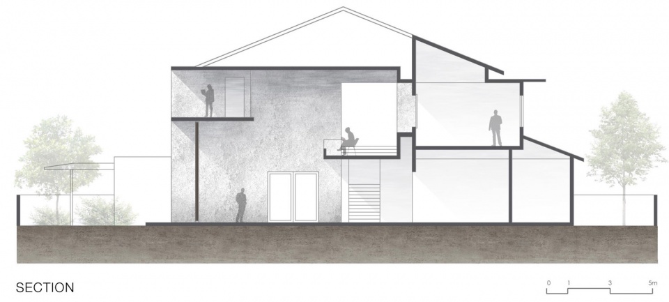 新的结构简单而大胆,与现有的热带郊区住宅形成鲜明的对比。从平面图上看,生活空间的方向与整个住宅的场地边界平行,从而在新旧结构间产生了一个三角形的“缺口”。它充当着安全通风采光井,为两侧房屋带去清凉的自然风。