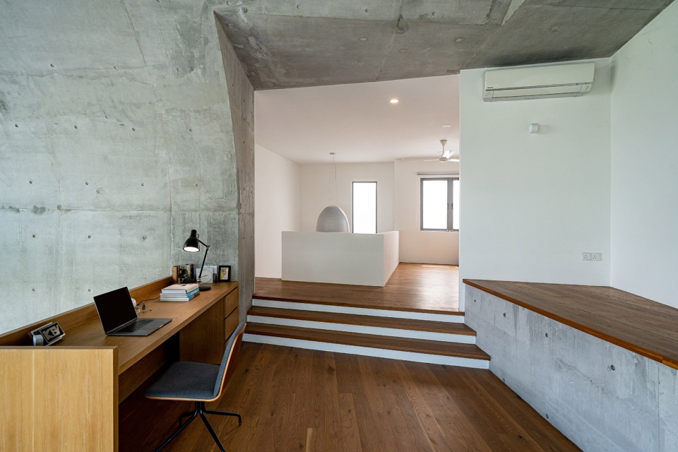The upper floor sets up a dramatic background with a play of curves and levels. The spaces are layered, creating a hierarchy of space. The study overlooks the living spaces and adjacent, a step-up platform corner for lounging. Behind this is a bedroom overlooking these spaces. The master bedroom connects through a bridge to the outermost floor section of the annex, and much to one’s surprise, an open balcony.