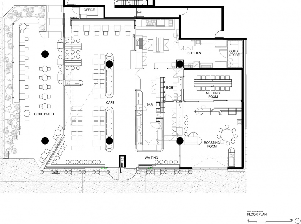 A strong, singular architectural language, inspired in part by the dense rainforests of Ethiopia where Campos sauce much of their ethically farmed coffee beans, draws together an expansive footprint into a series of intimate cohesive spaces.