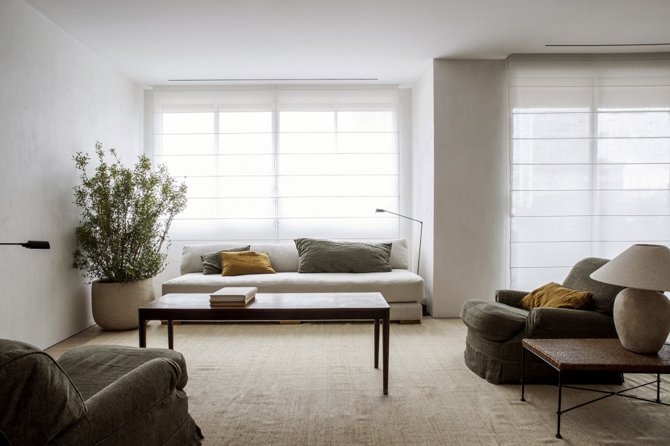 在装饰方面,设计采用了非常中性的主调并点缀以些许绿意,为空间整体赋予了清新的氛围。不同纹理的亚麻纺织品被用于空间各处,增添了轻松和舒适的感觉,