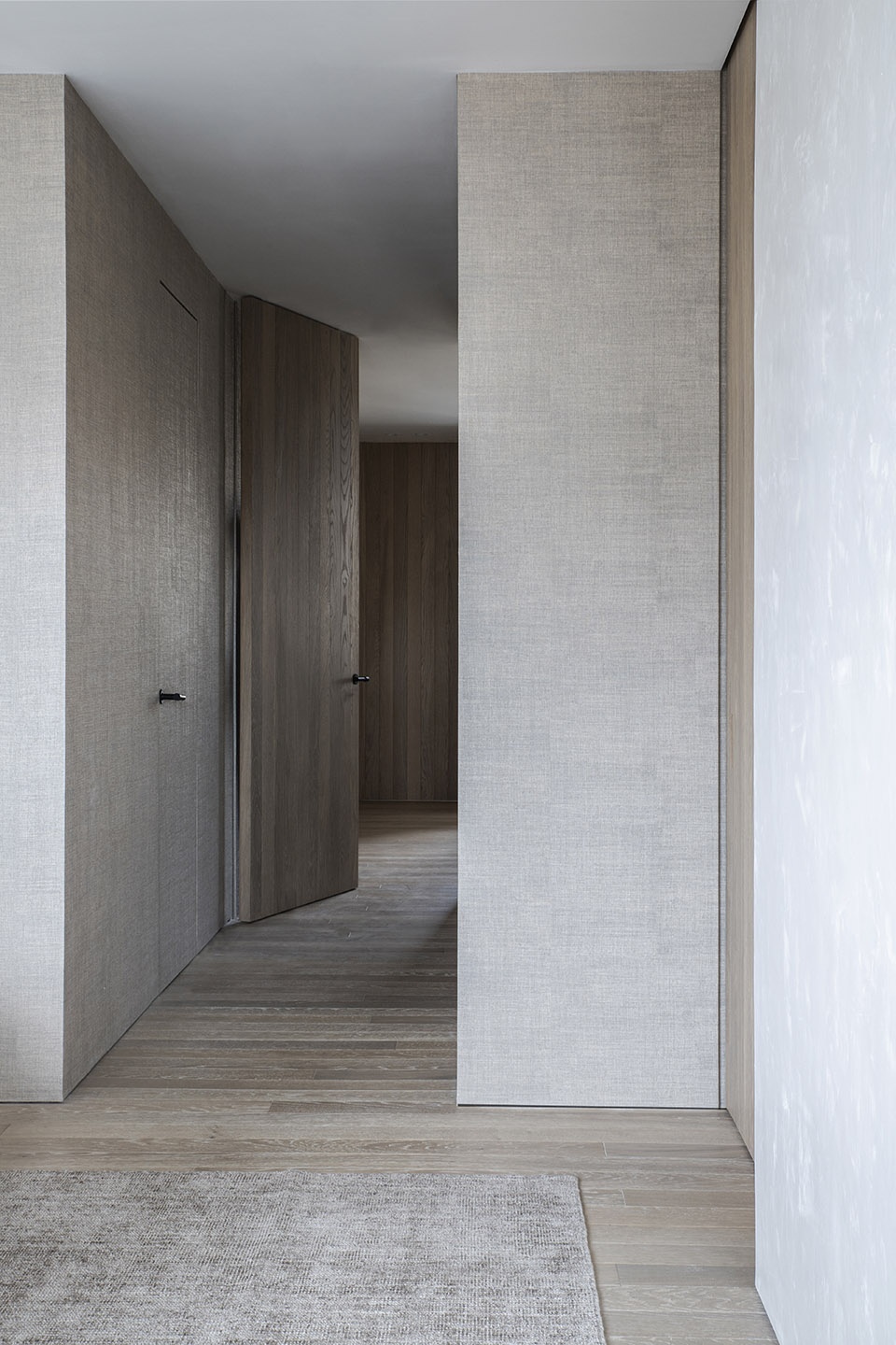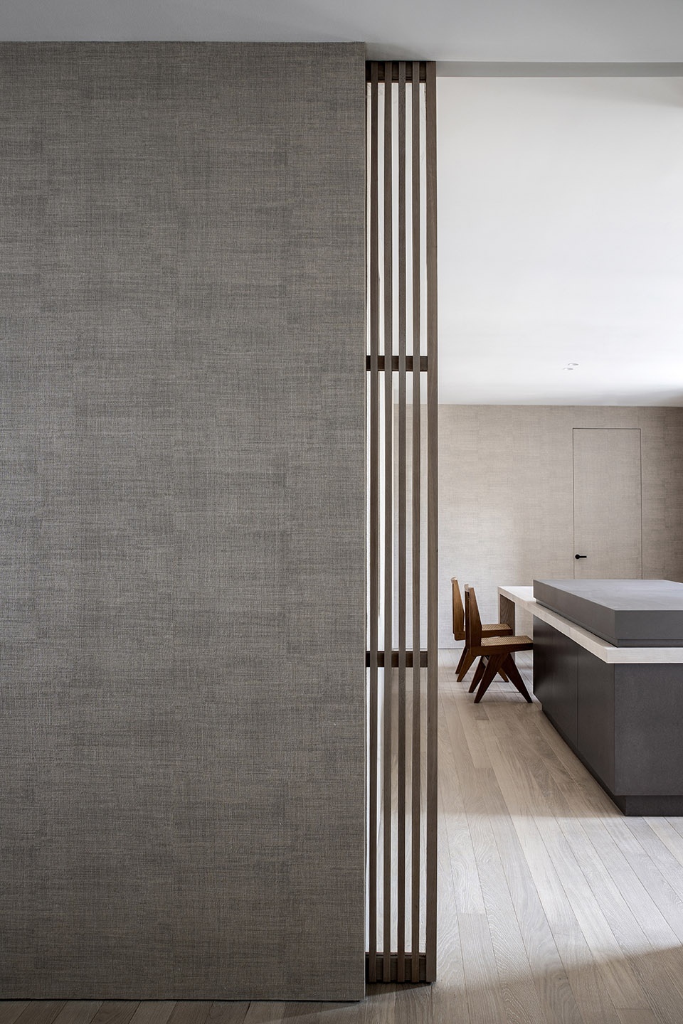 设计师在开放式布局的基础上加入了一些更加私人化的空间,例如浴室、办公室、衣帽间和食品储藏室等,所有这些空间被整合到两个用墙纸和木板包覆的“盒子”内部。室内饰面选择了较为中性的材料和色彩,公共空间使用了骨色的墙壁和手工装饰,私人房间则主要采用木材和壁纸。