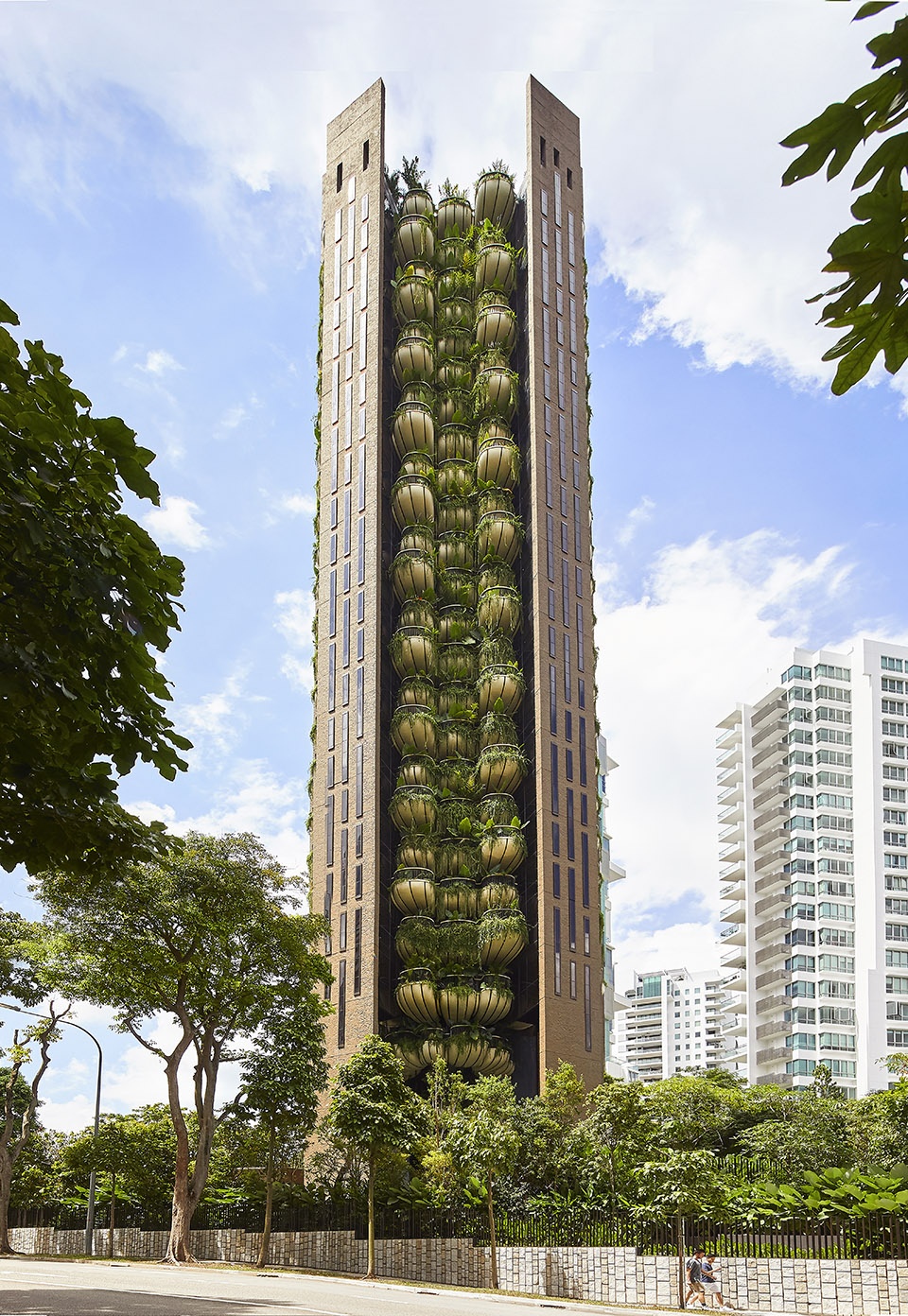 The building represents a unique way of living in the city, with its combination of evocative natural materials, textures and crafted details and its celebration of the area’s natural land- scape. Over time, the building is designed to mature, as the lush planting grows, like a sapling that has taken root beneath the streets, pulling the landscape of Singapore up into the sky. The lowest floor is raised 23 metres above street level so that every apartment benefits from views across the city skyline.