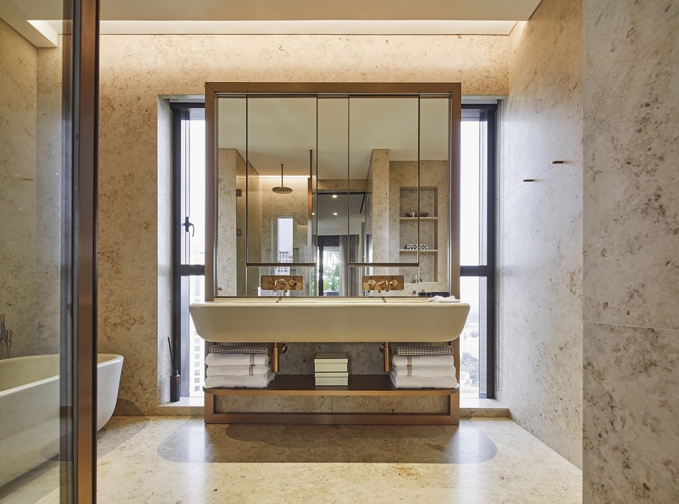 In the bathrooms, the sink, vanity unit and bath have been custom-designed for the project by Heatherwick Studio, and utilise a restrained yet rich palette of materials.