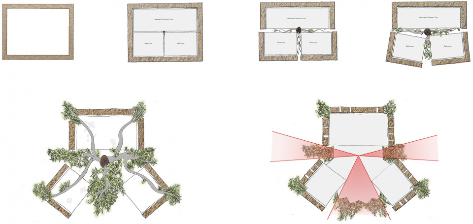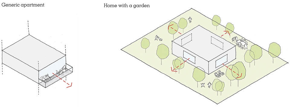 设计对传统公寓楼的方形体块进行了拆分,将服务设施移至场地边缘,从而令每间公寓拥有一个大型的中央起居空间,尺度较小的独立房间和宽敞的贝壳状阳台则环绕在中央空间周围。