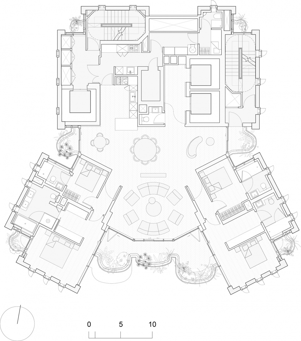 精致美观的电梯将居住者带到私人的楼层。每间公寓都设有一个宽敞明亮的中央空间,作为家人们聚会的场所。空间的外部被混凝土阳台和葱郁的植物环绕,同时享有远眺城市的视野。其他的私人房间和服务区域则被灵活地布置在主起居空间的周围。