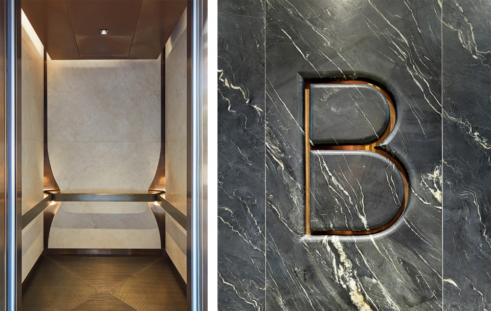 ▼电梯和大堂的黑色花岗岩墙面,the elevator and the black granite wall detail ©Hufton+Crow