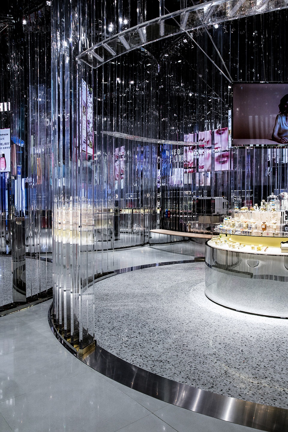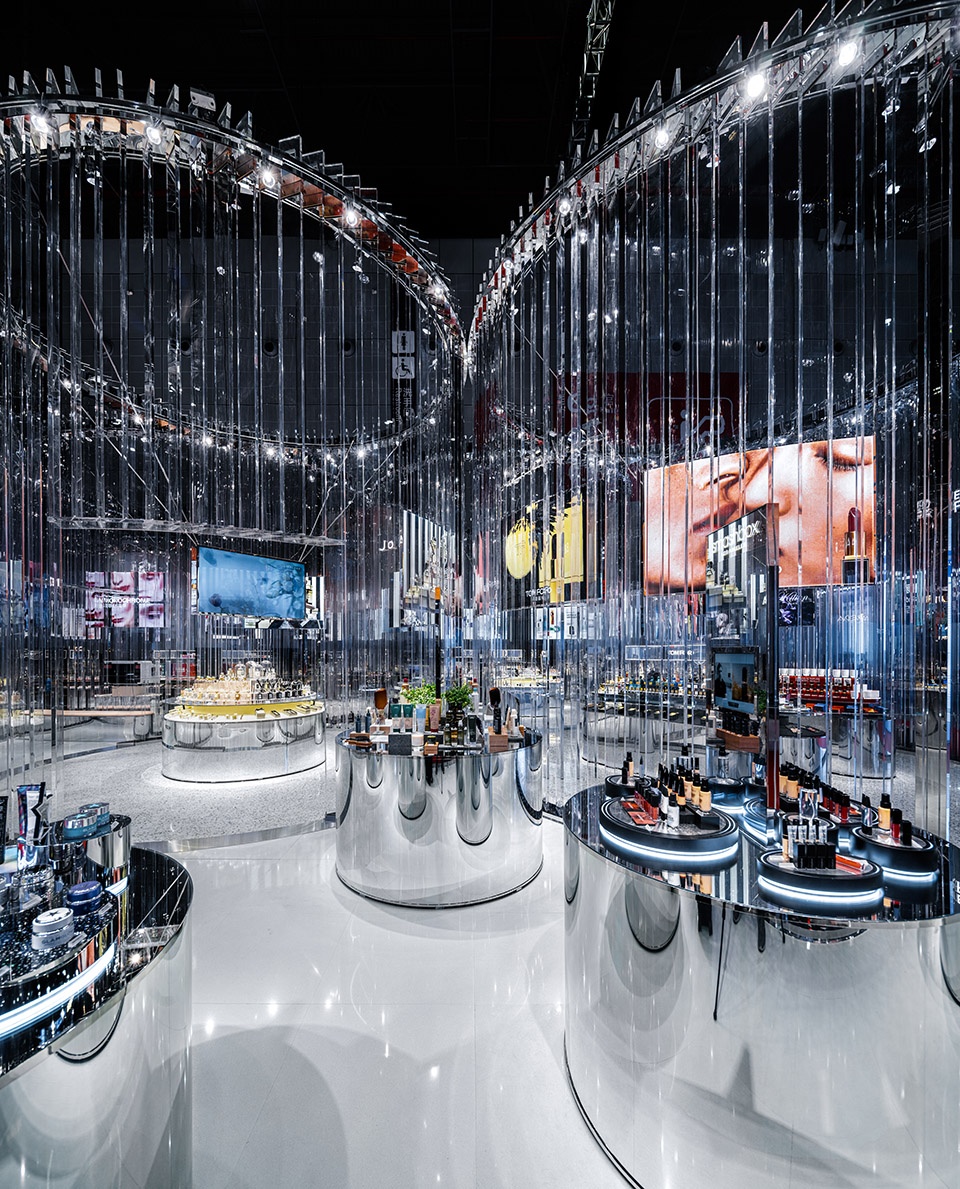 The positions of the acrylic columns had been carefully arranged using an algorithm to enable varied refraction at different angles. In this way, the pavilion remained visible to the outside, yet was still inviting with the dreamy atmosphere created by the fantastic optical illusions that filled every super-narrow vertical space between acrylic columns ,thus illustrating the Estée Lauder Companies tonality while attracting visitors.