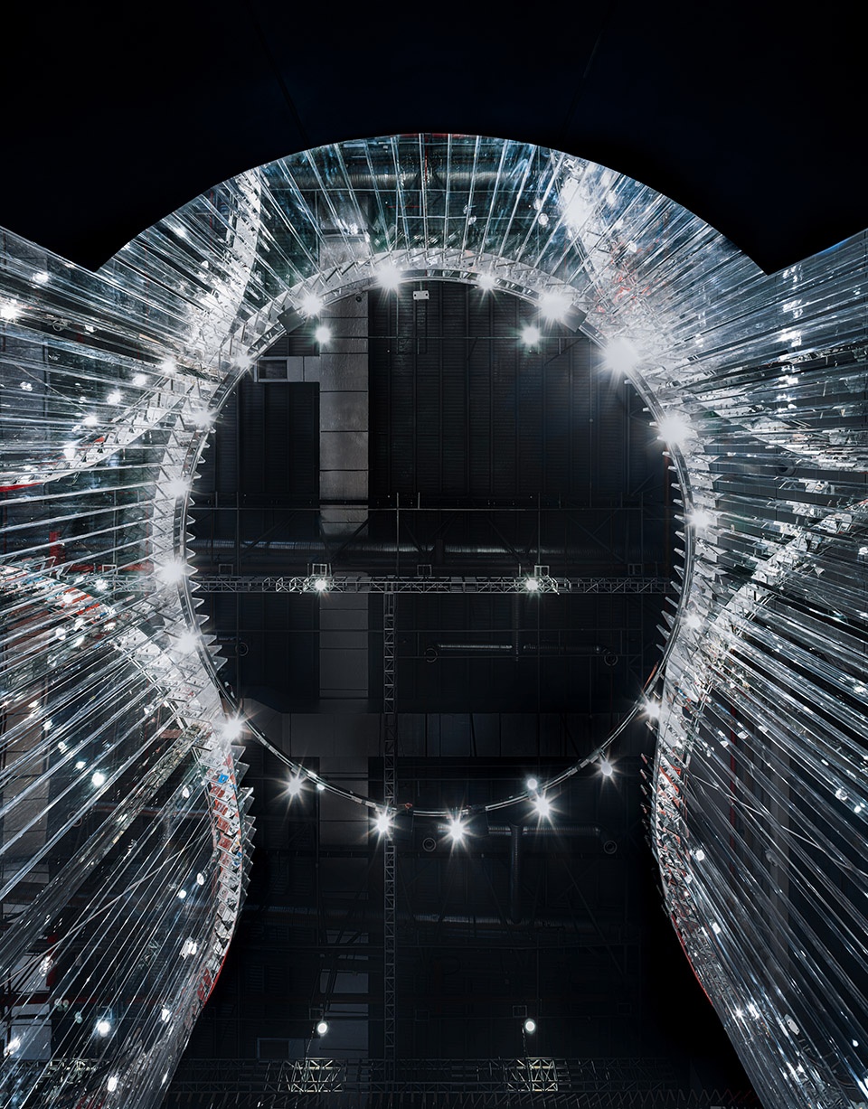 由于场地禁止使用悬挂结构,展馆采用整体独立支撑结构。为保持最纯粹的通透,栋栖与结构工程师精心设计了创新的亚克力/钢组合肋墙结构系统,将厚重的结构完美消隐于亚克力立柱中。 全部亚克力柱体由钢结构系统支撑,所有横向阻碍视线的结构部件被布置在顶部和底部,使得展馆内地面以上5500mm的垂直空间完全视线通透。