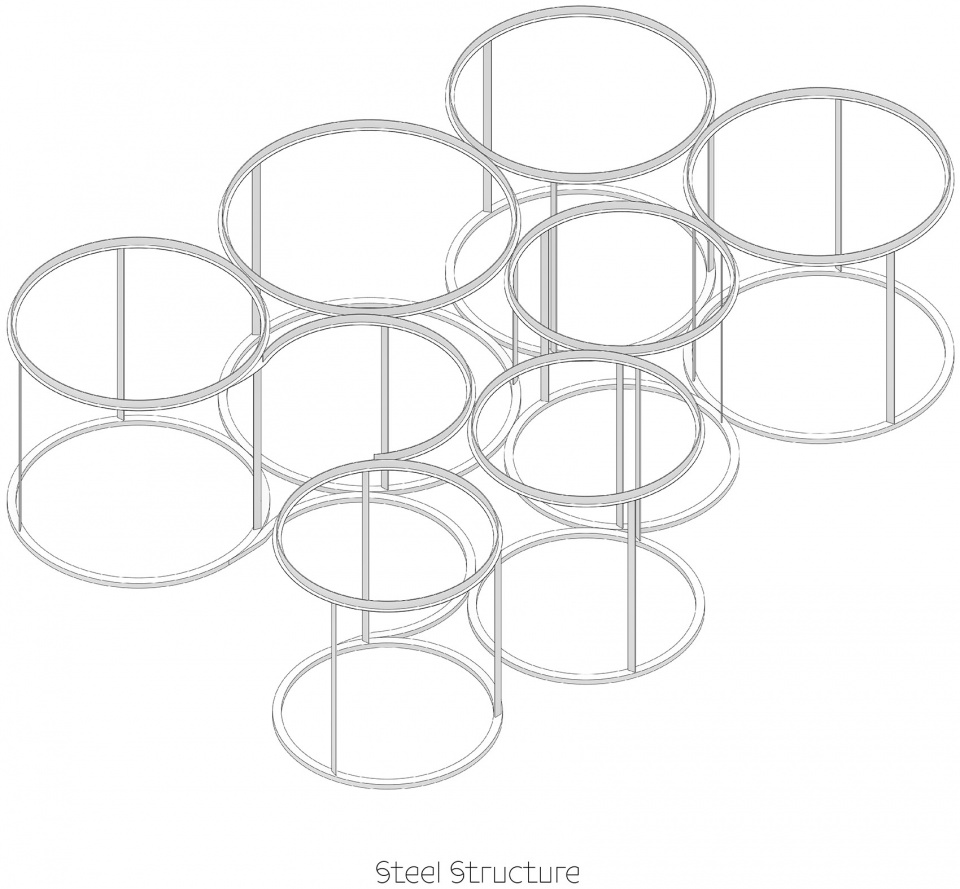 The steel structure in the vertical direction was close to the acrylic columns in size and was coated in mirror-finish stainless steel. The fin steel columns were also orientated to different algorithm-generated angles in plan to avoid the global buckling along the weak axis of a single fin column, and they were integrated into the gradient sequence of the acrylic columns. The steel roof beams, also mirror-coated, were of reversed T cross-sections, and were wrapped with acrylic columns that extended upward, which kept the horizontal steel structure on top stable while integrating the steel and acrylic to the great extent possible.
