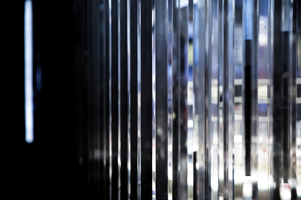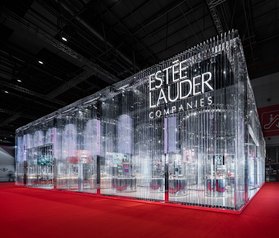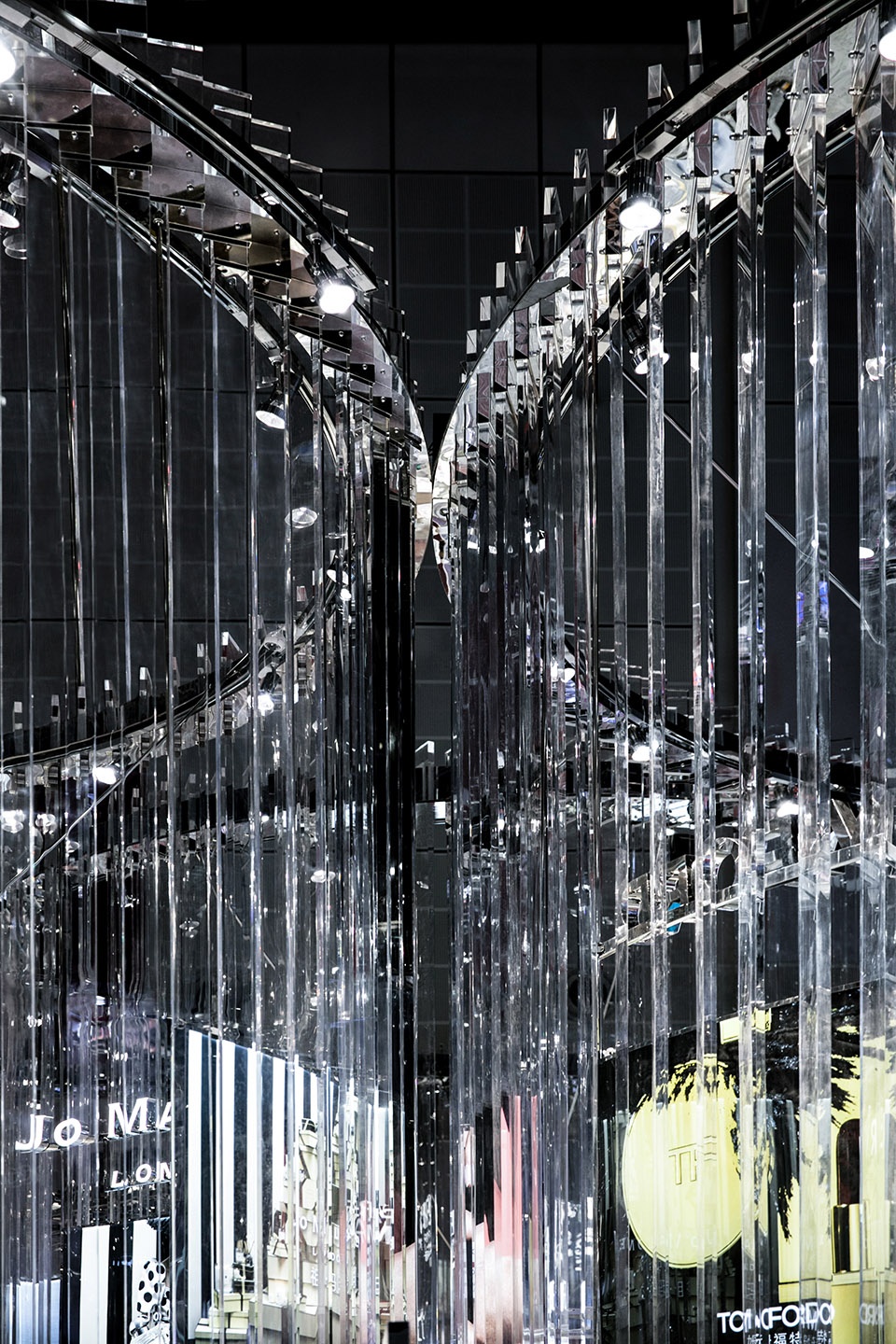亚克力立柱在平面上的角度由计算机算法生成,因此产生不同角度、丰富的折射效果。如此以来,场馆内不同区域的场景对外保持通透可见之时,却被巧妙控制为梦幻的超狭长垂直错位碎片,营造出雅诗兰黛集团整体气质的同时也最大化激发观众的好奇心与探索欲。
