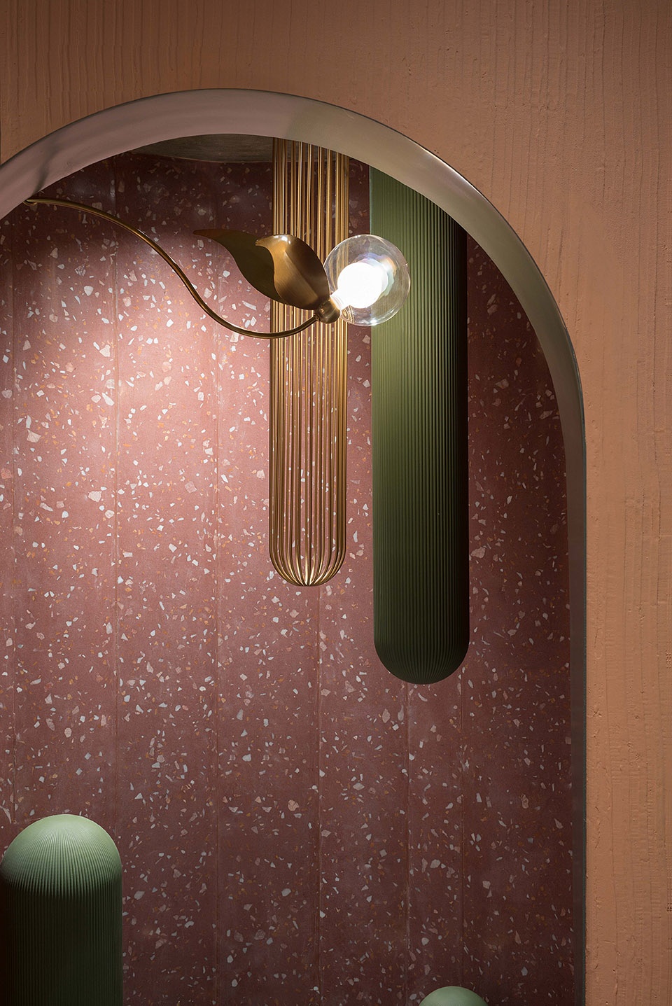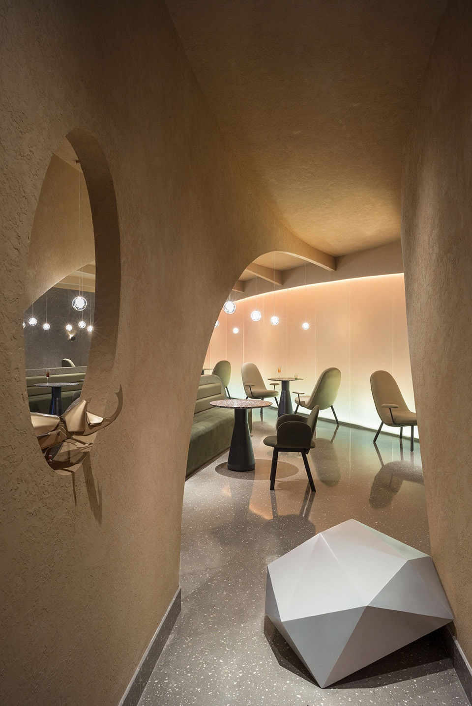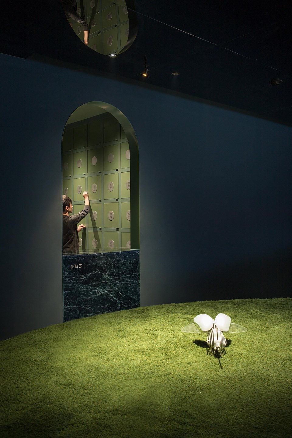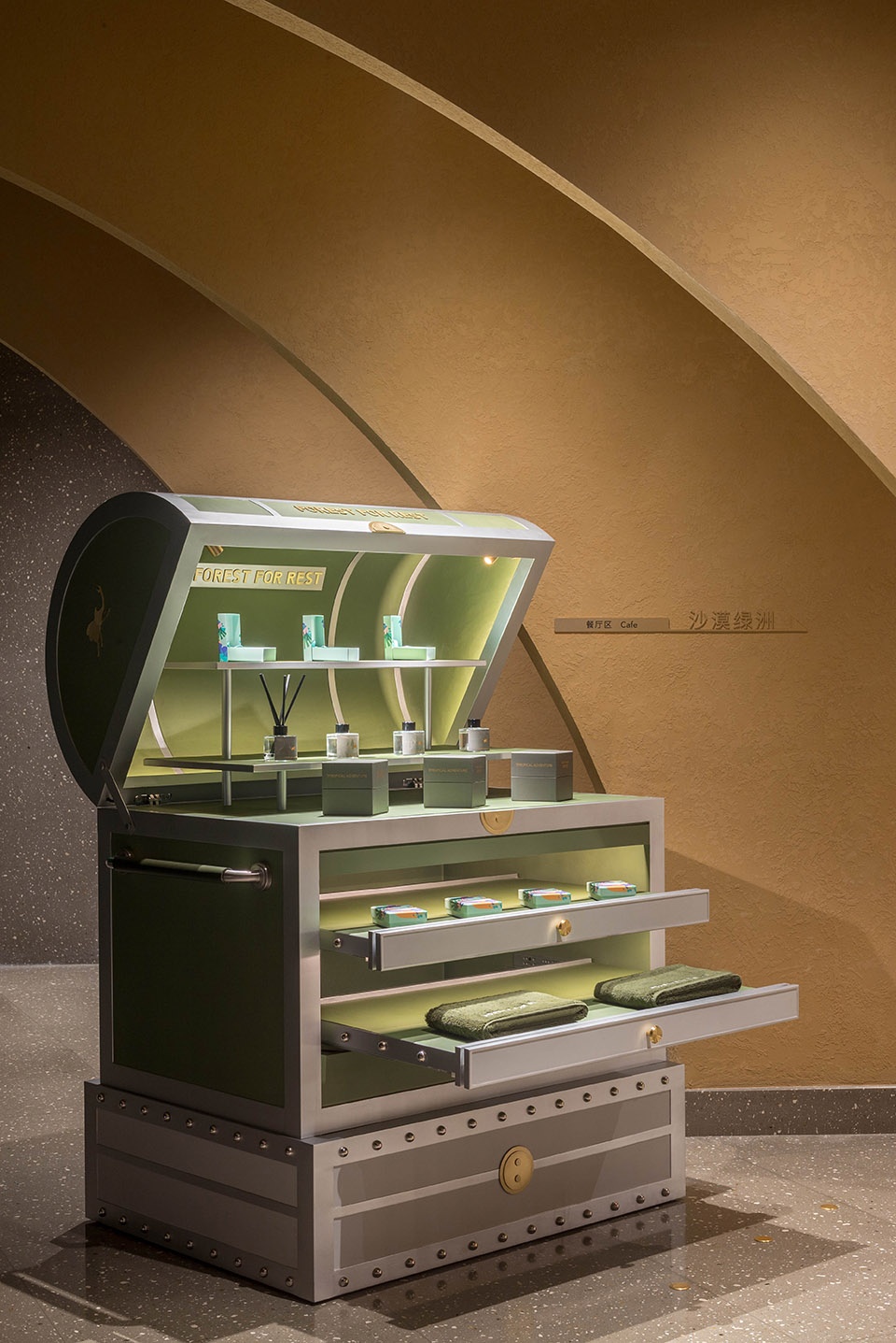 The project is situated at a popular pedestrian shopping street in Chongqing. Set on the third floor of a shopping mall, the space can be directly reached via elevators. The entrance area features several curved walls, providing customers with multiple paths to enter the inside areas. It refers to the desert in the beginning of the journey to explore the forest wonderland. The layered curve shapes echo the city’s unique mountainous terrain, so as to resonate with both the local customers and those from other cities. The showcase for displaying and selling related products is placed beside the curve walls, looking like a treasure box that brings a surprise to travelers in a desert oasis.