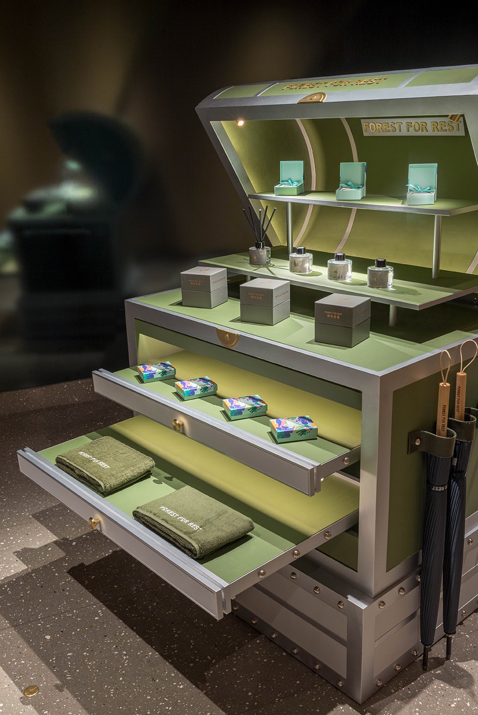 门店位于当地最热门步行街的三楼,从直梯上楼直接进入店面。入口处有意设计了多个弧面墙体,以多重路径引导消费者进入更深处的空间,将“探寻”作为森林奇境体验的第一个环节。同时整体造型也回应了山城独特的地貌特征,让重庆当地人或慕名体验足浴服务的外地游客都能获得共鸣。墙体之间放置了品牌周边产品的售卖展柜,外观是沙漠绿洲中给旅行者带来惊喜的藏宝箱。