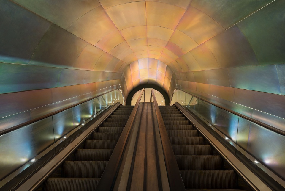 The secondary entrance of the space is connected to the escalators in the shopping mall. Finished with colored zinc plates and featuring a cave-like form, it’s a surprising bonus space.