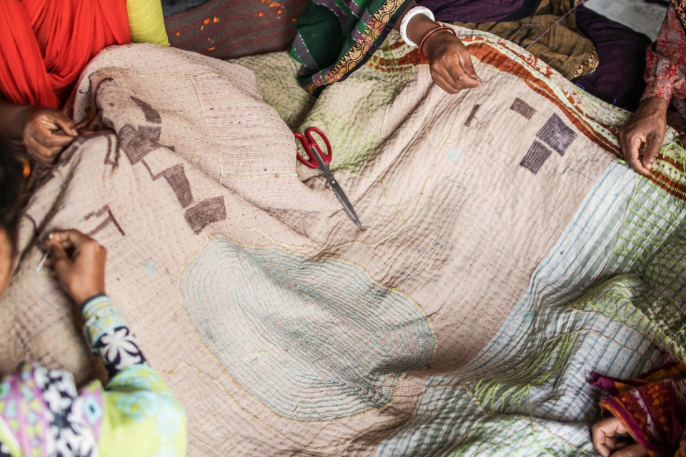 In the beginning, we were using the existing structures and the women were working outdoors. We said that everyone could take the textiles and work at home. We thought this decentralized way of working would be the best thing for women, as they could choose when to do the work, for example, when the children are asleep. Then we figured out that the women enjoyed working together and to have a chance to break out of their homes. I can relate to this feeling. The family is fantastic but sometimes you also need balance to be outside and meet other people. Also, while the women are stitching, they chat about their life and support each other all the time.