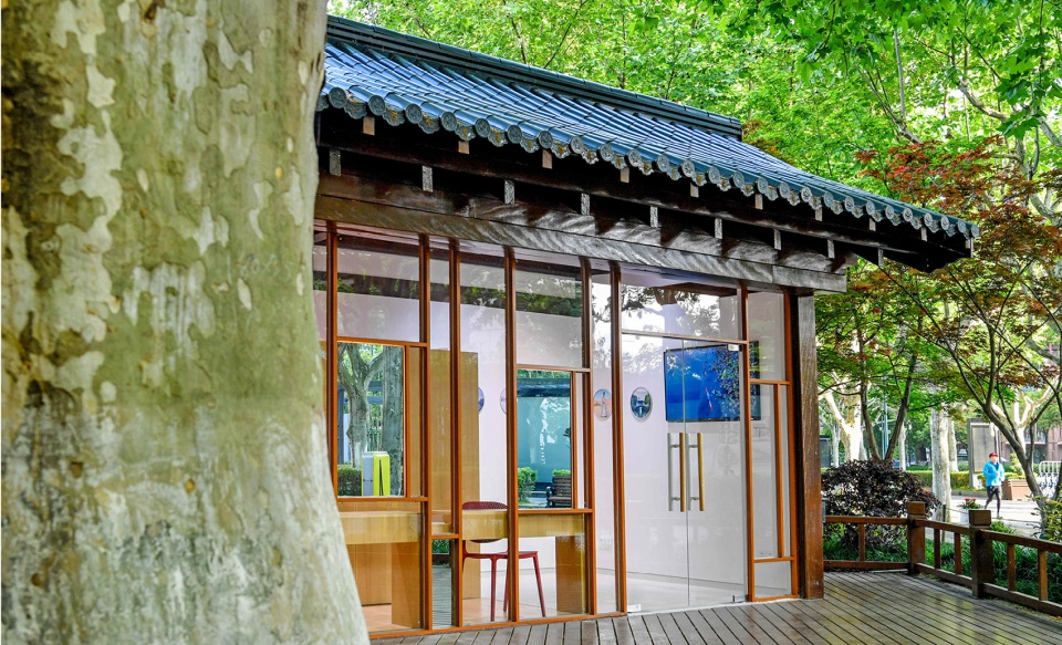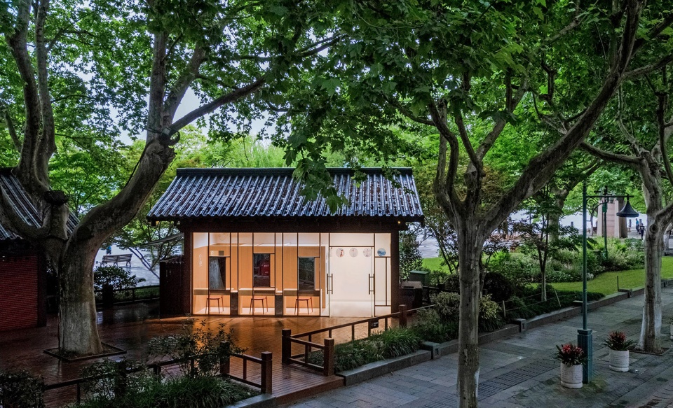 项目位于西湖四公园,坐落于西湖与湖滨路步行街之间的绿化平台上,是西湖风景区提升改造工程的一部分。我们的设计任务是在这个室内净面积只有16.5㎡的小房子里为知名汉服电商品牌设计一家汉服体验馆。本项目作为该品牌的首家线下体验店也需兼顾品牌展厅的作用。