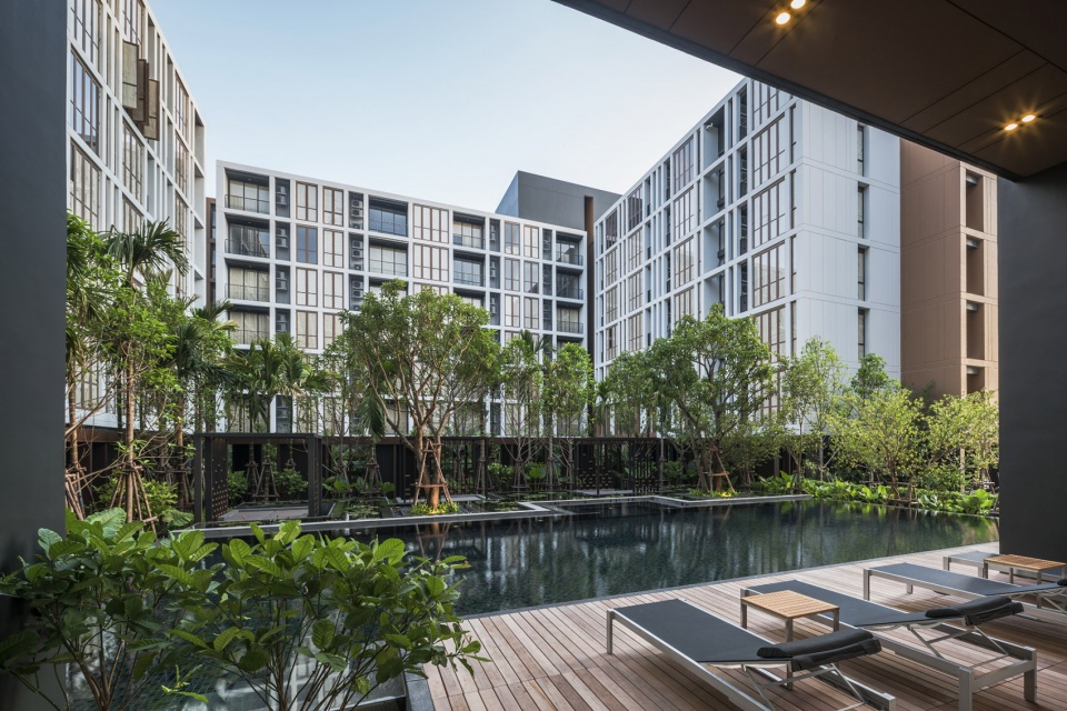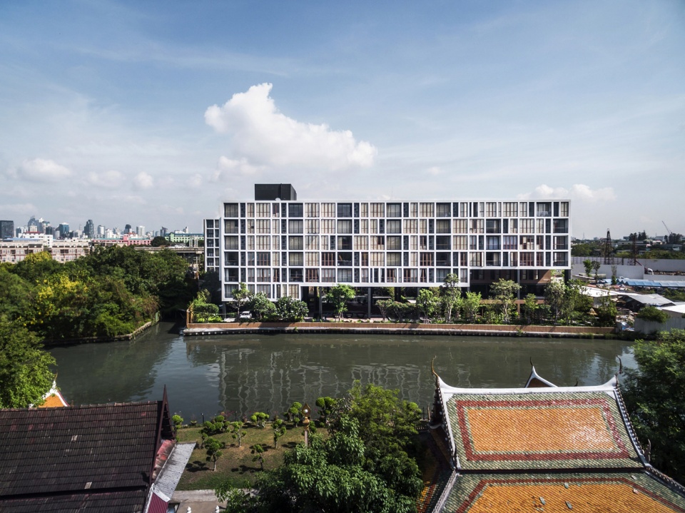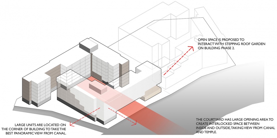 两栋L型的楼房一起形成了一个内部庭院。临河的建筑底层是通高的架空空间,以深灰色的柱子支撑。这样的设计不仅在内庭院和运河之间建立联系,制造良好的通风条件,而且可以创造从庭院开始,穿过莲花池、游泳池、露台空间,一直通向河对岸寺庙的连续视野。