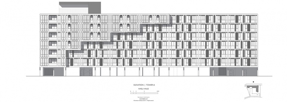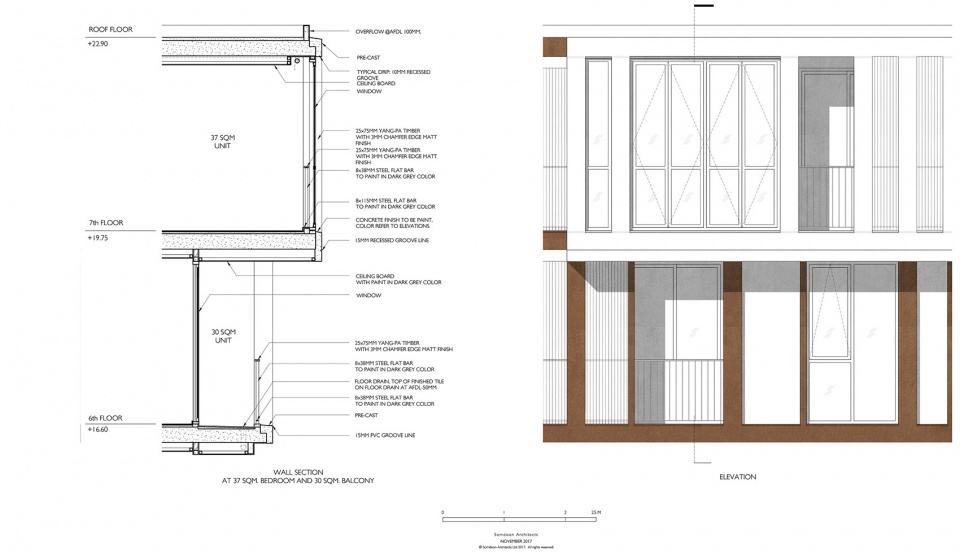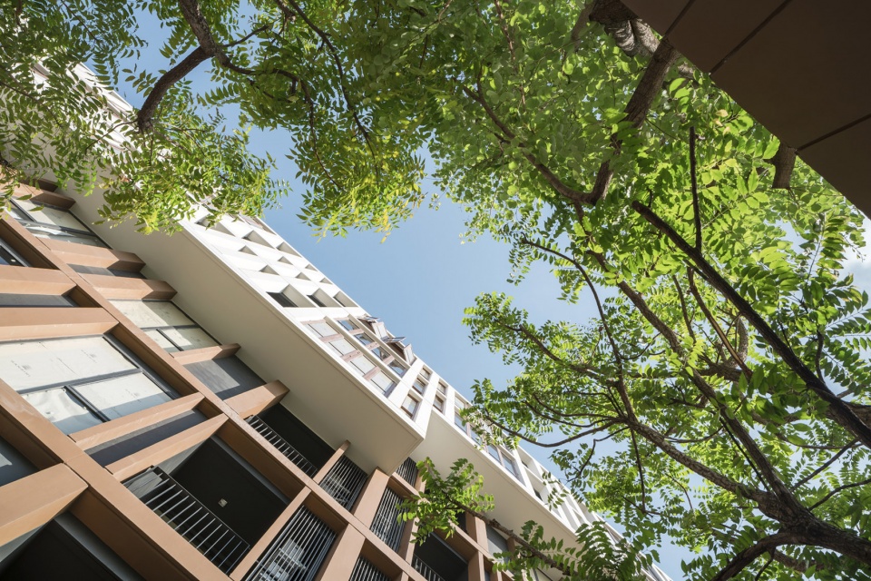 The façade of the 7floors buildings was created and separated by difference of unit sizes. The brown façade with vertical concrete sun-shading fins, which belongs to small units, is on the perimeter and lower floors. The white facade extends outward providing more living space inside. They are mostly on the upper floor, and fully applied on the internal courtyard and the canal sides. Unlike the other, it has double full-height swing window with steel railing on the inside. When they are open, it create a sense of semi outdoor living space like the old day.
