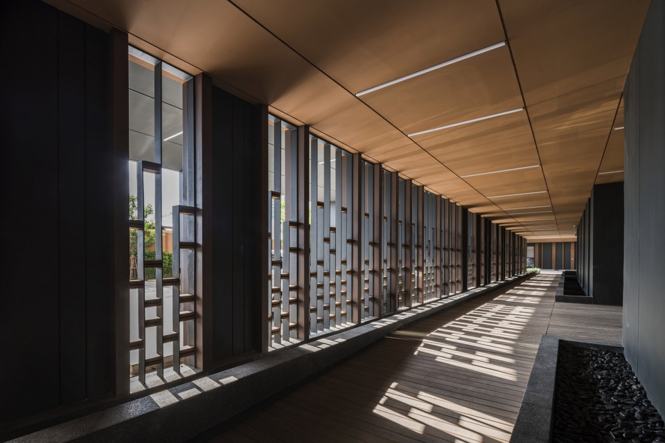 Two L-shaped buildings are placed to create an internal courtyard. The building nearest to the canal is lifted by dark grey columns into high ceilings. This creates connection between the internal courtyard and the canel which is not only allowing good ventilation, but also a continuous field of view from the courtyard to the lotus pond, swimming pool, terrace space, and out across the canal to the Buddhist temple.