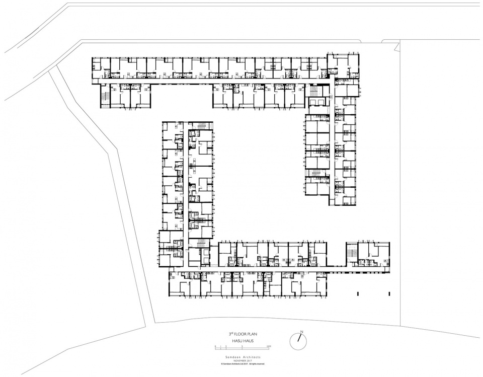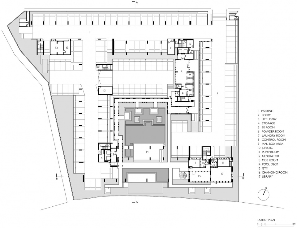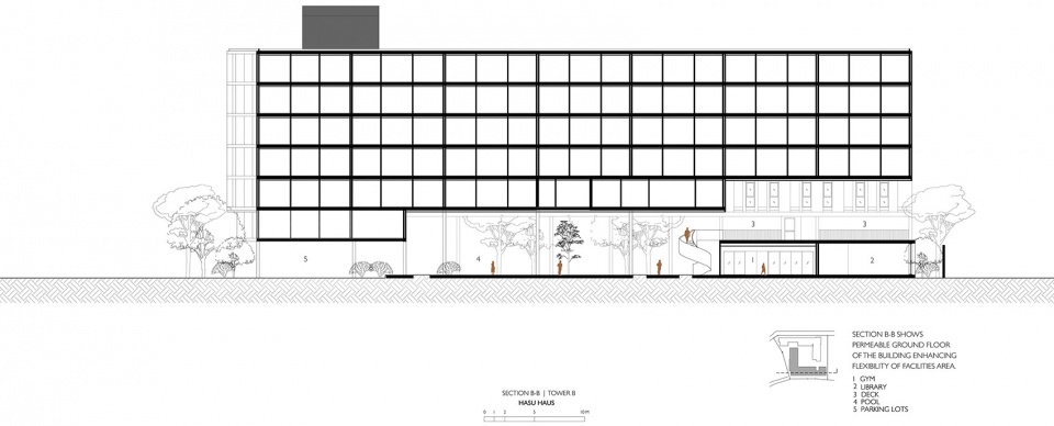 Besides the common outdoor areas, gym and library are also placed along the canal. Their flat roof becomes second floor terrace, which is accessed by a spiral staircase standing sculpturally in the open area.