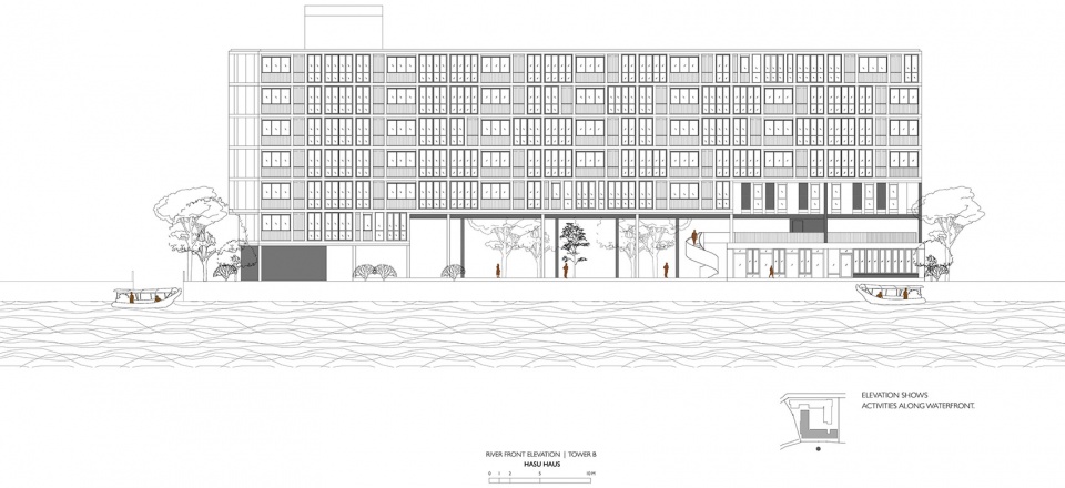 Despite rising high, all building elements from massing to window design create harmony rather than dissonance, and revive the way of living along with waterways.