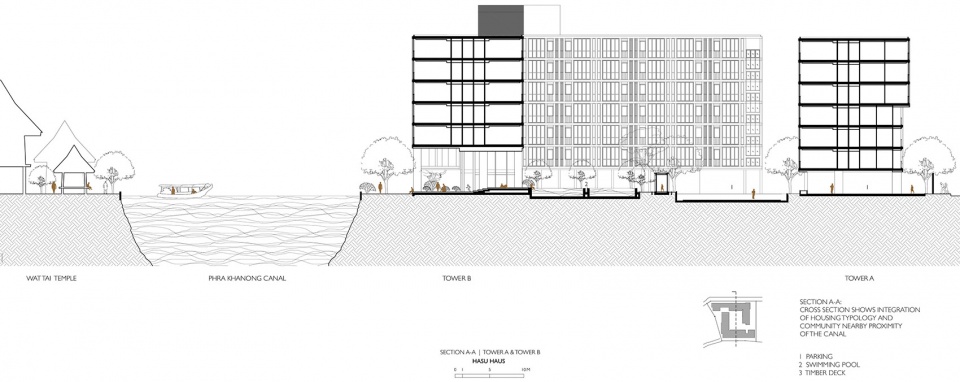 Hasu Haus的设计希望对传统水边生活进行重新编译,使其更加适合现代高密度的生活方式。项目基地位于曼谷市中心外,这里即将迎来新一轮开发。基地三面是住宅和新的房产,剩下的一面与Prakanhong运河相邻,河对面是一座古老的佛教寺庙。