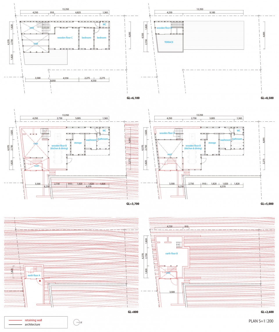 Several small areas were dug out to make the most of the terrain’s nature. Height differences in the ground level emerged by these digs, and various retaining walls to suit each level were designed. Then, “five small retaining walls” that merge nature and artefact appeared on site. The shape of each retaining wall differs, however, all follow flat structure reinforced by L or T shaped ribs and support the earth load with its thickness, which is set as thin as possible. The thinness of the wall was an attempt to acknowledge the retaining wall – construction material – as an essential part of human living space, and implement this wall in the interior of the house even with its geothermal feature. As a vestige of the earth and architecture’s struggle for their coexistence, this complex border appeared between them should be able to offer vibrant moments in life at this living space.