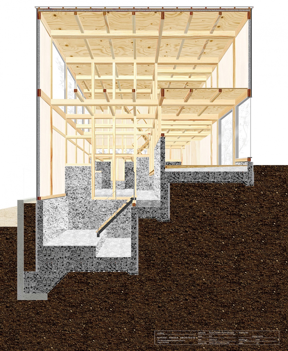 该建筑堆叠在由地基和挡墙组成的土质结构顶部,上下两层结构分别由木材和钢筋混凝土构成。下部钢筋混凝土结构被打造成一个位于地板下层,可用作起居区域的基础内部空间。在将两层结构进行组合后,房屋入口处形成了一个可容纳各种跃层空间的大型中庭。