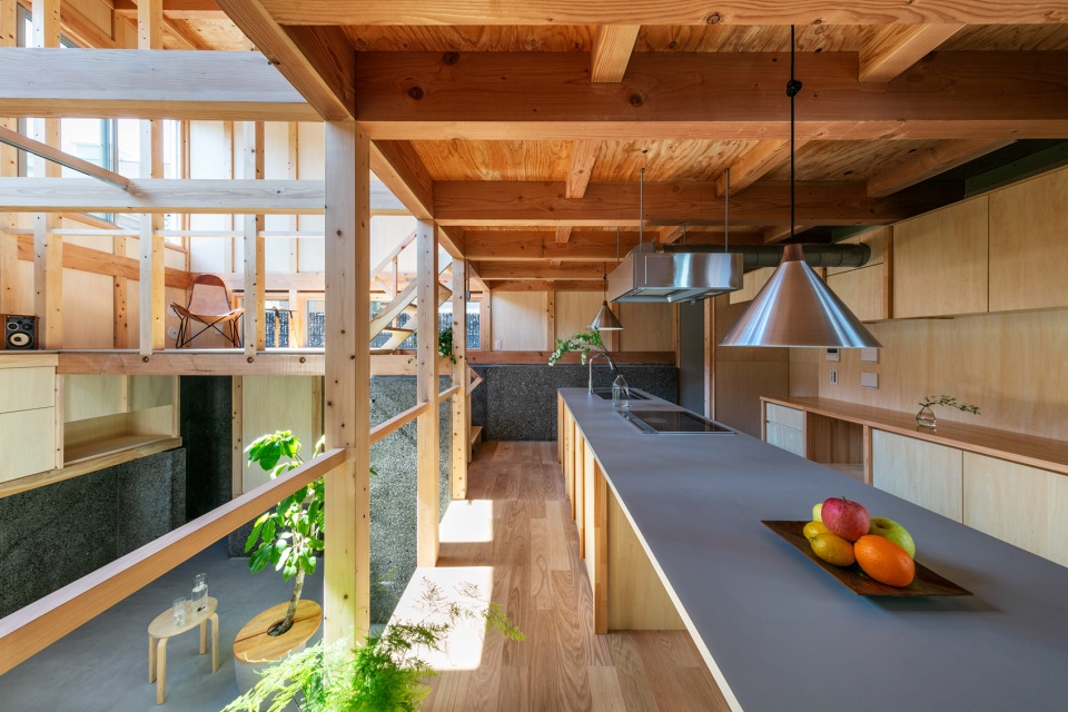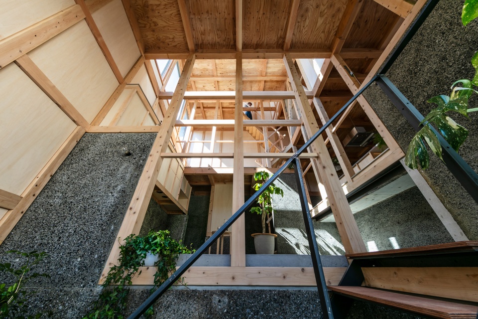 The architecture is stacked on top of this structure, tracing the earth shape by the foundation and retaining walls, and constructed with two layers, which are RC and timber. A space produced by the lower RC structure is basically the underfloor space but turned into an interior. By also using them as living area, together with the space of the timber structure, the building offers one large atrium that accommodates various skip floors with different environments.