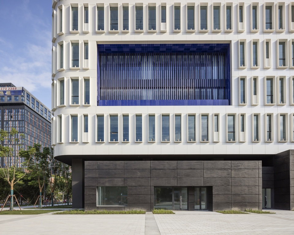 建筑设计整齐划一,以祥和安静来回应上海这个不断变化的城市。楼房中设有数个凉廊,以彩色陶瓷管装饰,这是对中国传统竹制工艺的现代转译。颜色和材料的互动为建筑增添了几分动感,当人们总不同角度观看建筑时,其立面总是不尽相同。