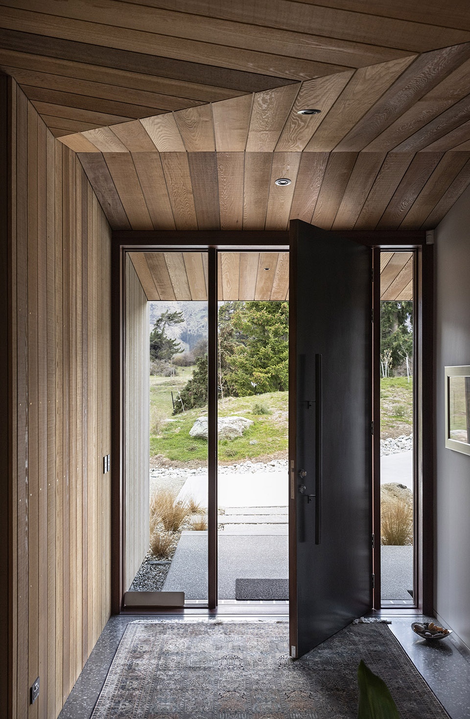 ▼住宅入口,朴实无华的色调从室外一直延续到室内,在景观与居住空间之间建立了联系,the entry of the house, the understated palette continues from the exterior to the interior of the home, forming connections with the landscape ©Simon Larkin Photography