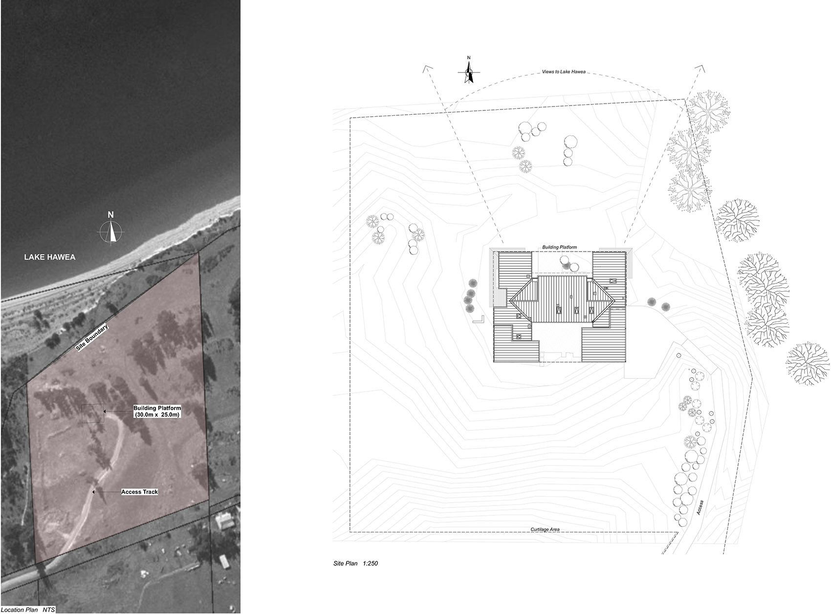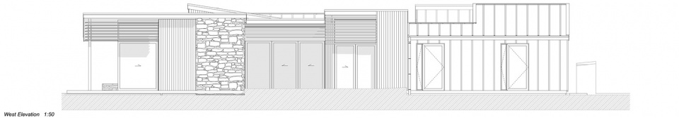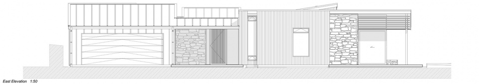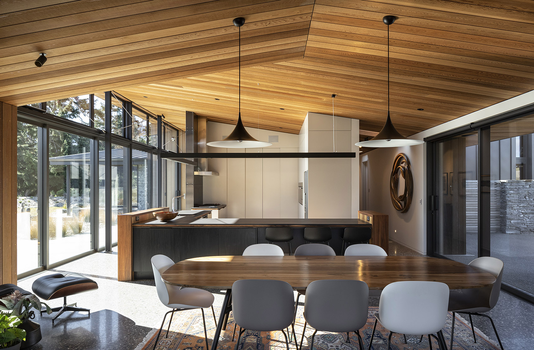 An understated palette of cedar, local stone, and steel continues from the exterior to the interior of the home, forming connections with the landscape. This is furthered by a pair of heavy schist walls, which flank the living spaces and contain seating, shelving and a fireplace. These walls are orientated to the view and form a pair of organising axis that run through the house. They echo early settler’s cottages that are common to the area, establishing a sense of history in the fabric of the new building. Cedar ceilings angle the eye towards different aspects of the view. The living and bedroom spaces are positioned to take full advantage of the wide-spanning vistas. Garaging and utility spaces are located to the rear.