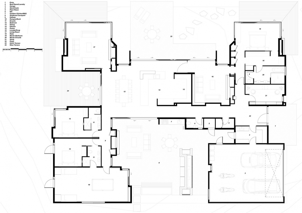 Planning restrictions limited the width and height of the building, and the often strong winds that come in off the lake had to be taken into account when establishing the shape of the house. Arranged in an ‘H’ configuration, the bulk of the building protects the house from the wind, creating a series of terraces and courtyards that can be occupied depending on weather patterns.
