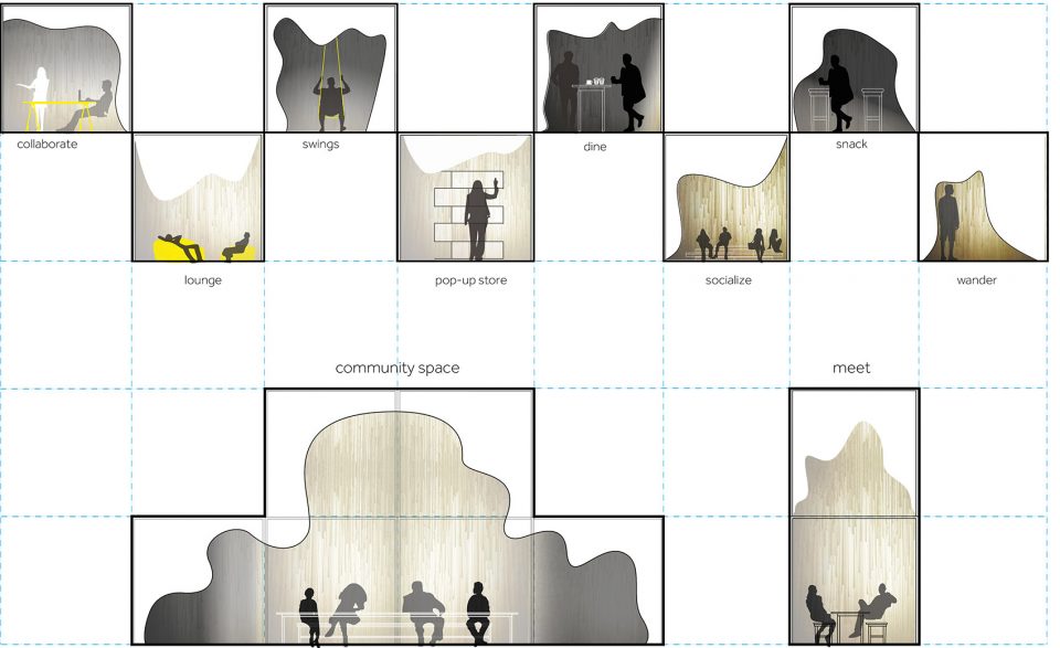 These parameters then informed the various taxonomies of voids that catered to the programmed activities and were mapped on to a modular grid. A low-tech, cost-efficient, incremental, modular system was developed using re-usable construction scaffolding and laser-cut IKEA drapes. The voids created by the subtractive operations on the stacked drapes are taxonomized into activity facilitators and occupied as such. A modular grid 3x3M grid is made from construction scaffolding and IKEA drapes are cut and arranged in a pattern derived from a parametric algorithm. The differences in height and width result in people reacting to the spaces in different ways and colonizing it intuitively.