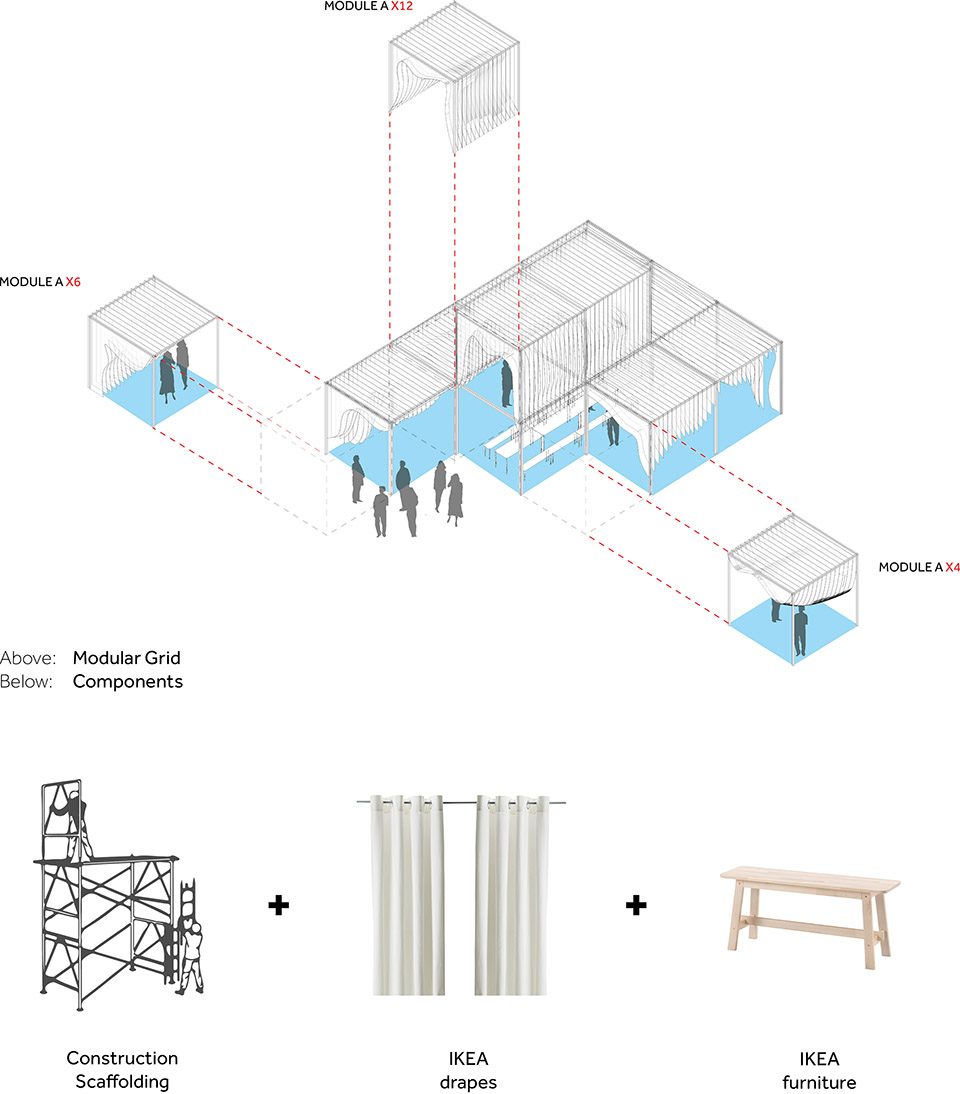 在这些参数的基础上设计师们制造出了不同分类的空间,并将它们映射到一个模块化的网格上。设计师利用可重复使用的建筑脚手架和激光切割的宜家布帘,开发了一种低技术、低成本、渐进的模块化系统。堆叠的窗帘上利用减法操作所产生空间成为活动空间,并引导着人们去使用它。建筑脚手架制成了3×3米的网格结构,而设计主体则用宜家窗帘切割而成,它们按照参数化算法设计的顺序排列而成。空间高度和宽度的不同让人们对其做出不同的反应并有着各自的使用方法。