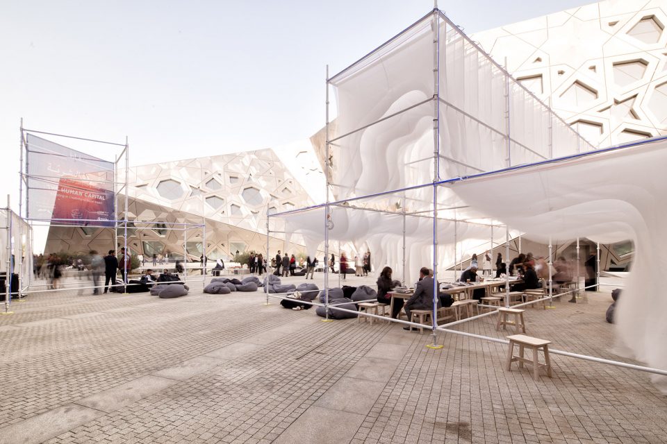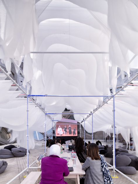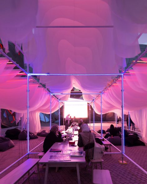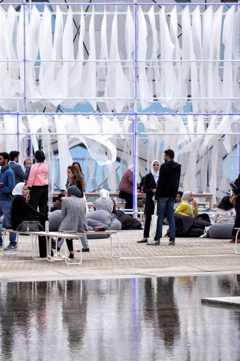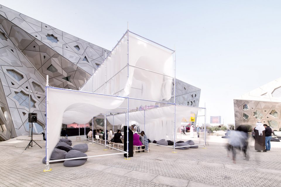 Studio Toggle was invited by Nuqat, a nonprofit organization based in Kuwait to create an outdoor space for their cultural forum “The Human Capital 2018”. The location given was the outdoor plaza of the newly opened Sheikh Jaber Al-Ahmad Cultural Centre in Kuwait City. The design of the pavilion stemmed from a desire to create a lightweight, soft and malleable space habitable in novel ways. The pavilion is meant to be colonized based on the activities that it will accommodate. These activities were analyzed and broken down into its anthropometric parameters.