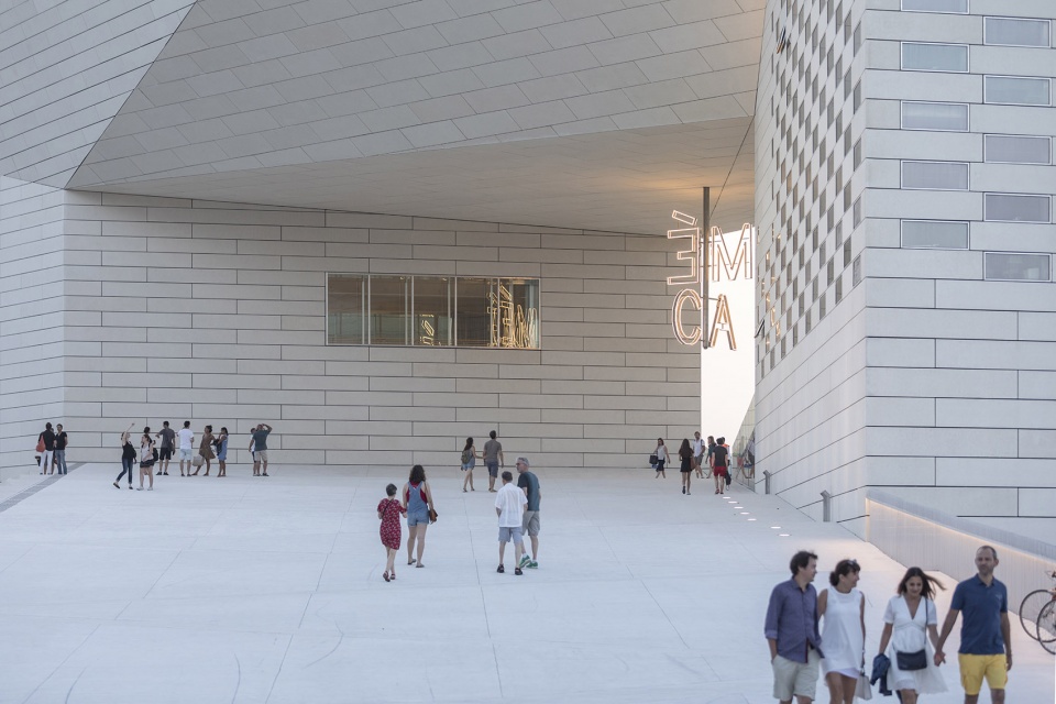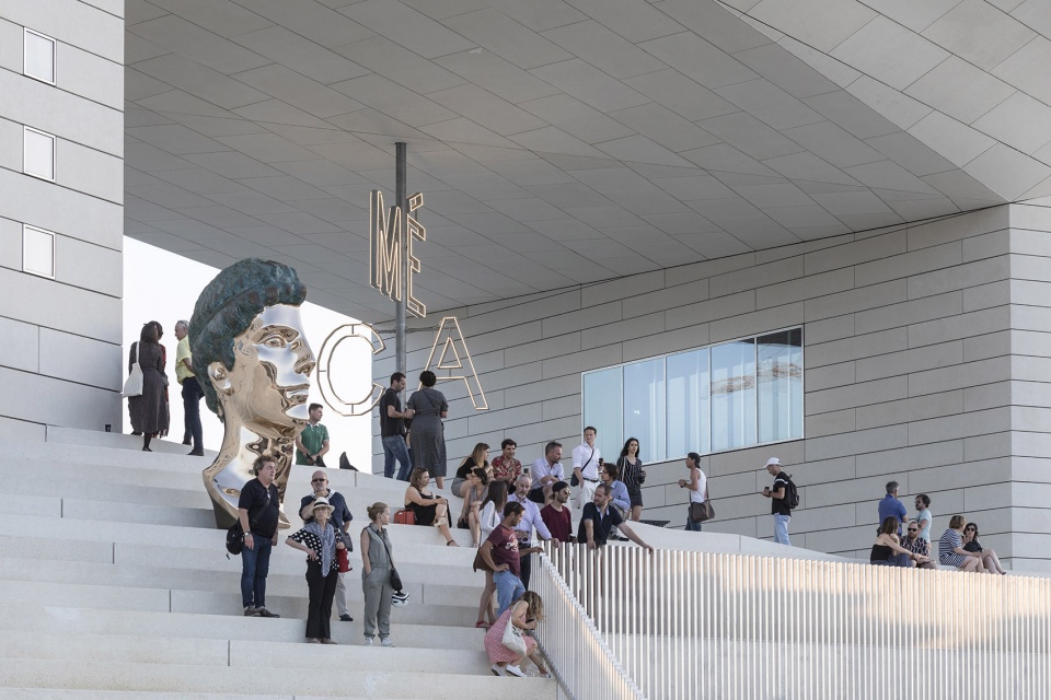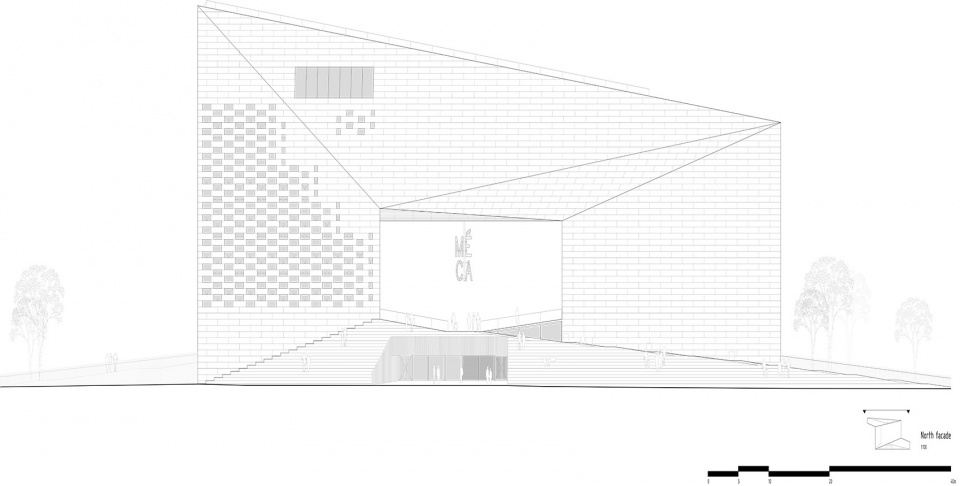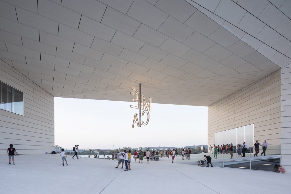 一系列台阶和坡道将公众直接引导至位于MÉCA中央的1100平方米的户外公共空间,使来访者能够在Quai de Paludate大街与河滨步道之间自由地漫步。7米高的MÉCA标牌通过白色LED等照亮了该区域,犹如一盏具有城市尺度的、充满现代感的吊灯。在特殊的场合,MÉCA的户外空间可以被用于举办音乐会和戏剧表演,也可以作为画廊的延伸部分来容纳雕塑和各类艺术装置。朝向河岸的入口处伫立着由法国艺术家Benoît Maire创作的赫耳墨斯青铜雕像,促使人们对该地区的当代文化进行思考。