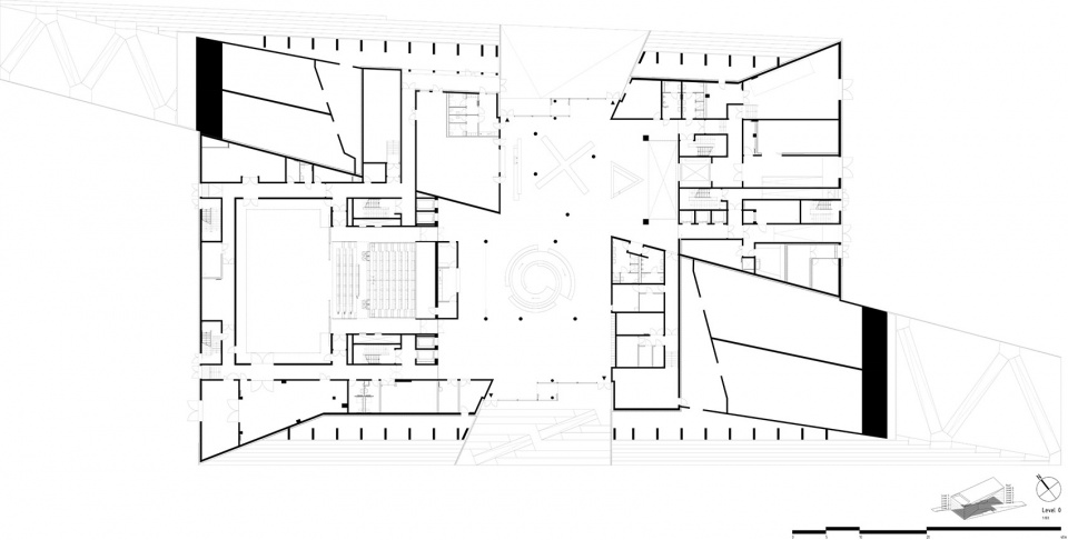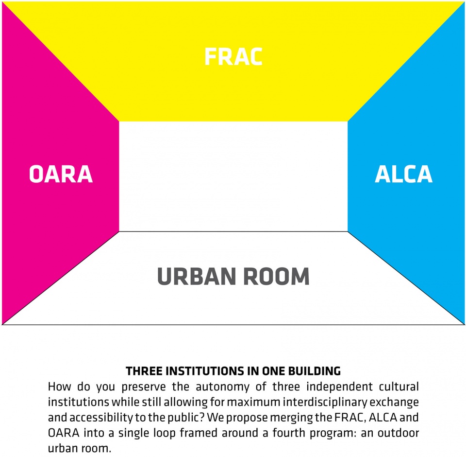 该建筑被构想为一个包含文化机构和公共空间的“环路”:首先,河滨步道以斜坡的形式过渡到作为“城市客厅”的广场区域, 随后与建筑立面融为一体(透过立面可以瞥见OARA的舞台空间以及ALCA的办公区),最后在FRAC展厅的屋顶天窗处形成闭合。