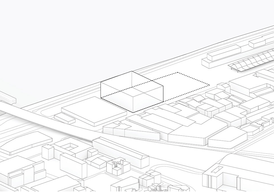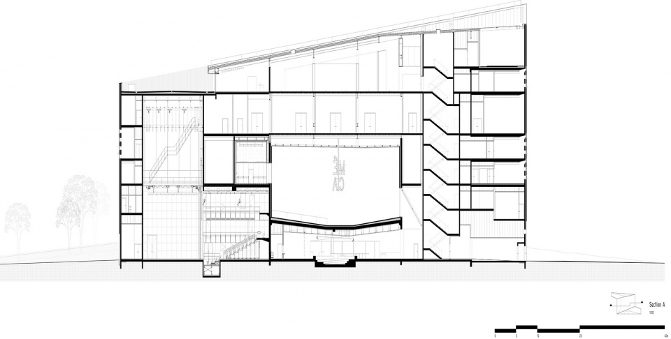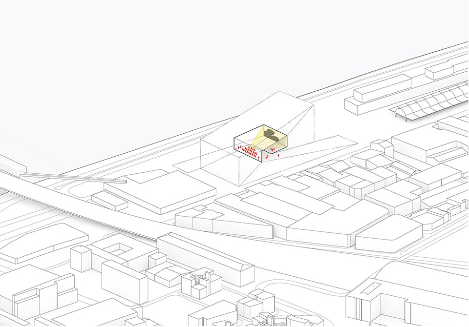 The building is conceived as a single loop of cultural institutions and public space by extruding the pavement of the promenade to become the ramp that leads into the urban living room, the façade with glimpses into the stage towers of OARA and the offices of ALCA, and the rooftop enclosing the sky-lit galleries of FRAC.