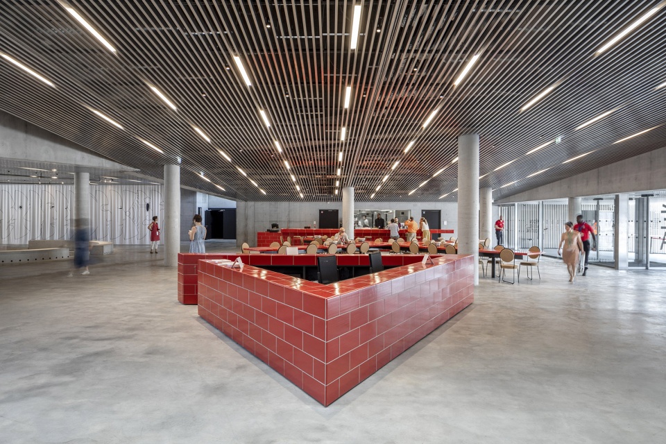 从首层进入MÉCA之后,来访者将到达大厅区域。人们可以在螺旋形的下沉空间中就坐休息,或者在Le CREM餐厅享受美食。餐厅中的红色家具和软木座椅是由BIG以城市的葡萄酒文化为灵感而设计。餐厅和电梯为参观者提供了一个巨大的“潜望镜”,使其能够看到户外“城市客厅”里的活动,同时也在室内和室外空间之间建立了对话。