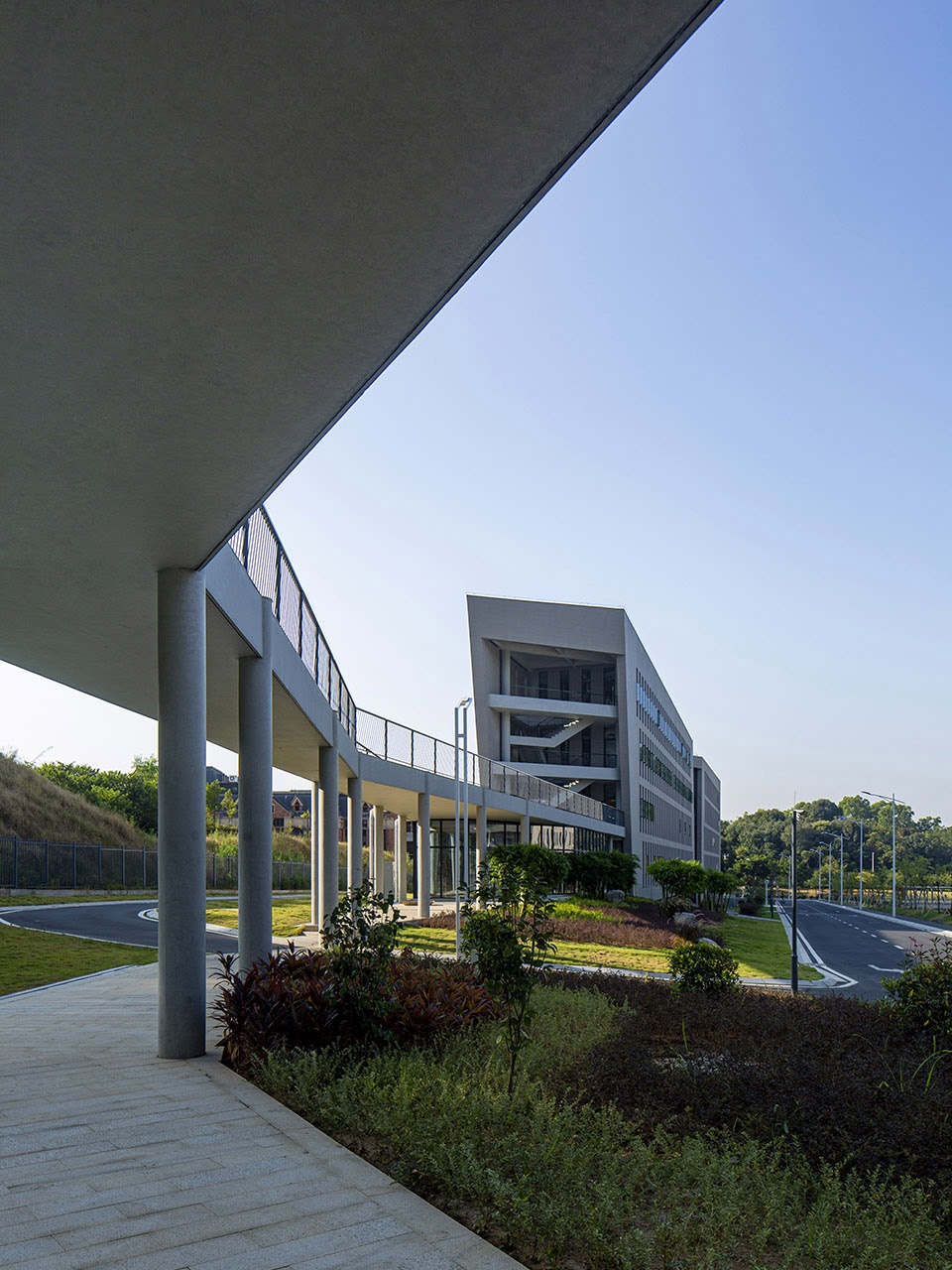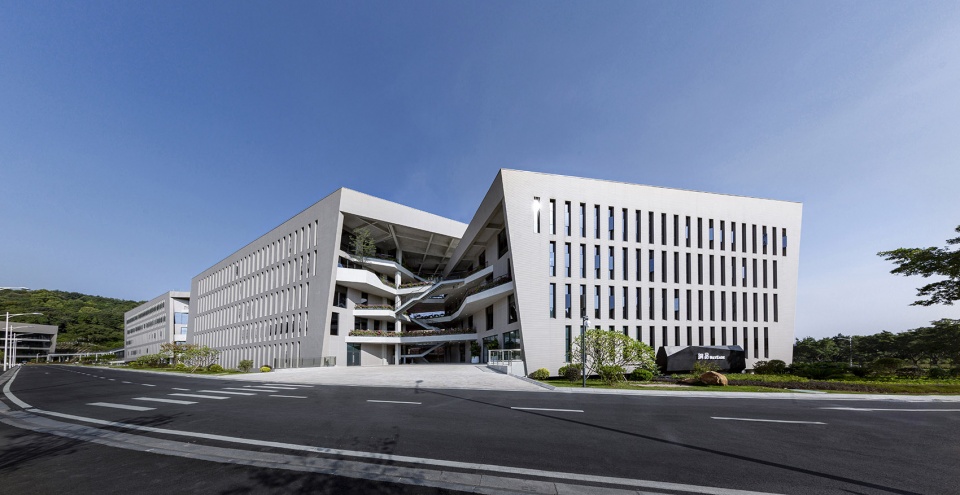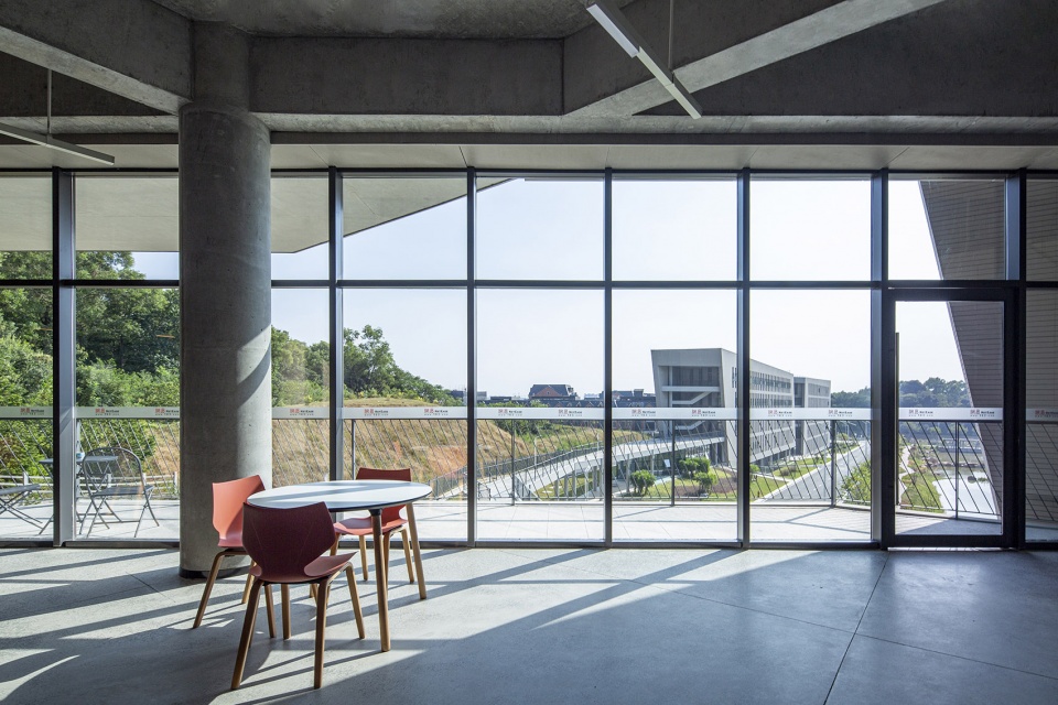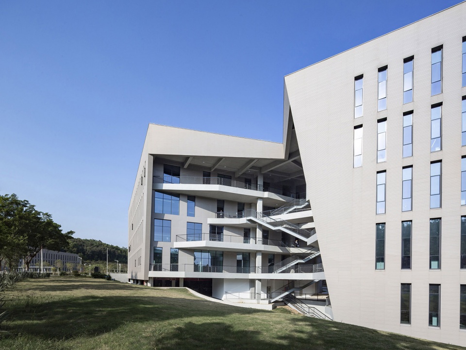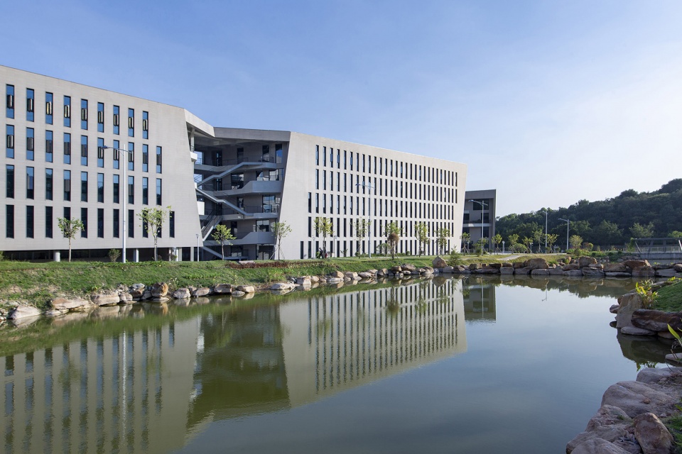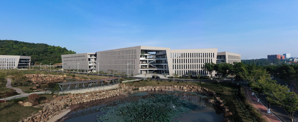 The project sits in a relatively discrete downland in the cul-de-sac of Tianhe Software Park, Guangzhou, hemmed in this horseshoe-shaped massif with a beautiful natural landscape, fronting a lake and set against the hill. Variation in topographic height being significant, the construction land is narrow and irregularly shaped. Building height is set under 20 meters, as required by urban planning, with a respect for circumferential hilly mass. Interestingly, the design team was involved in urban-planning this area years ago and determining the height limit, which now challenges them as an architectural constraint.