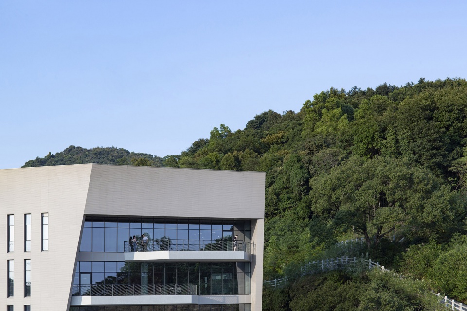 建筑造型设计富于实体感,如巨石般的强烈体积感既与山体及湖面形成合理的对比关系,又满足了室内环境的控光需求。