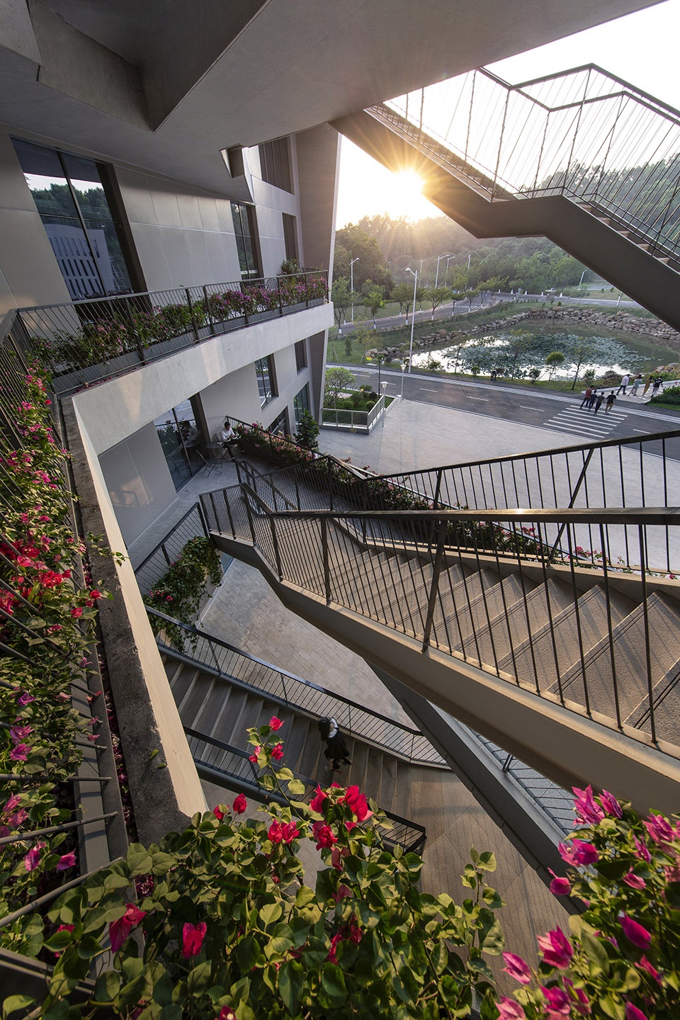 Two main office buildings are placed along the east and north of the site, connected by the ground-floor cafeteria. Staff canteen and gym can be found on the west, while access to the office buildings from the central lake is realized by a covered bridge. This design encourages IT workers to refrain from sedentary work and instead, during recess, dining or workout, walk through the open terraces, staircases and covered bridge and savor the gardenly ambience.