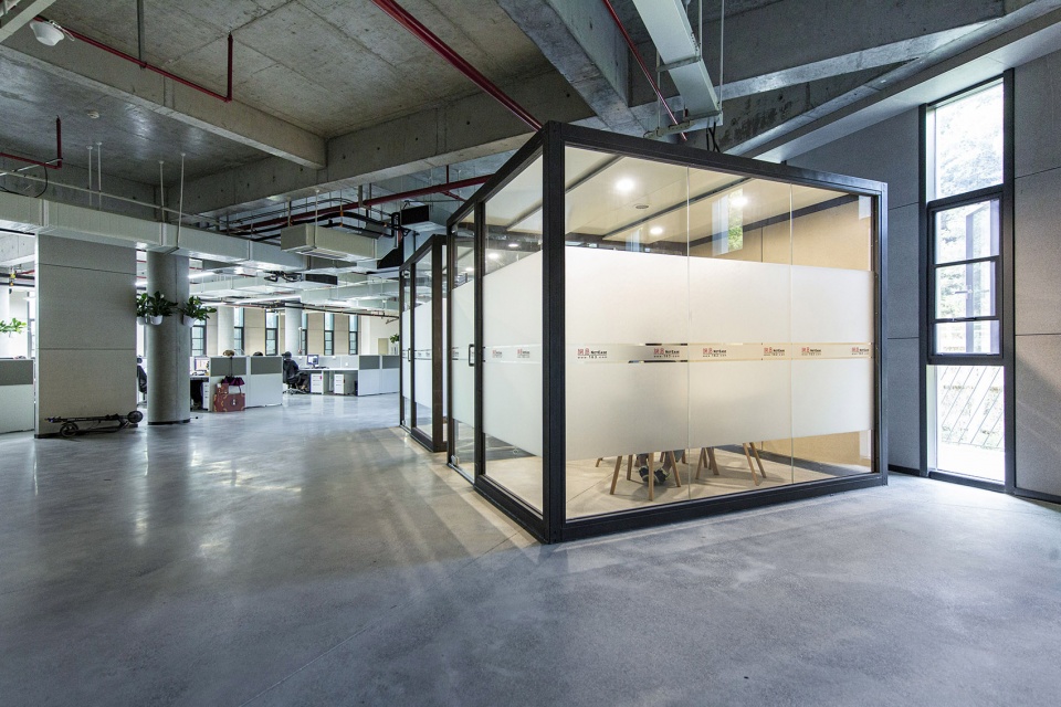 室内空间采用较为粗犷的处理方式,柱体、梁、天花为素混凝土面,机电系统在天花下灵活布置,会议室等密闭空间采用独立盒体的方式植入;充分考虑了办公空间的灵活性以应对发展变化。