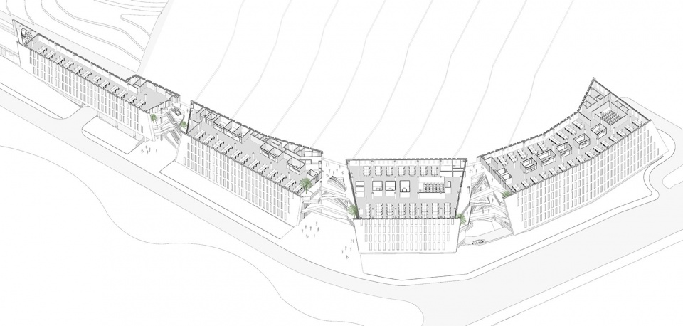 The original natural waters are expanded on purpose to create several lake surfaces with continuously rising elevation, capable of concentrating precipitation of the site and hills. The building mass is set facing the open water, generating natural ventilation via local environmental wind. The semi-underground parking lot leverages the topographic height variation for natural lighting and ventilation, with the throw-in benefit of a suspended architectural form.
