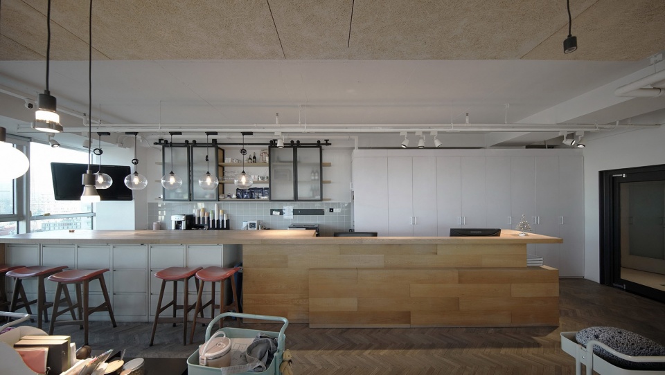 The office entrance does not have a Logo wall, no reception, and right at the entrance is an eight-meter long coffee bar. Coffee machines and kitchen appliances are all available for use. This is the place for colleagues to relax.